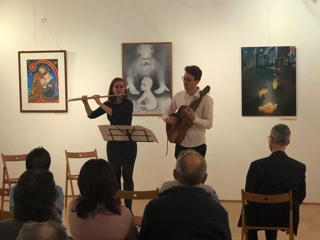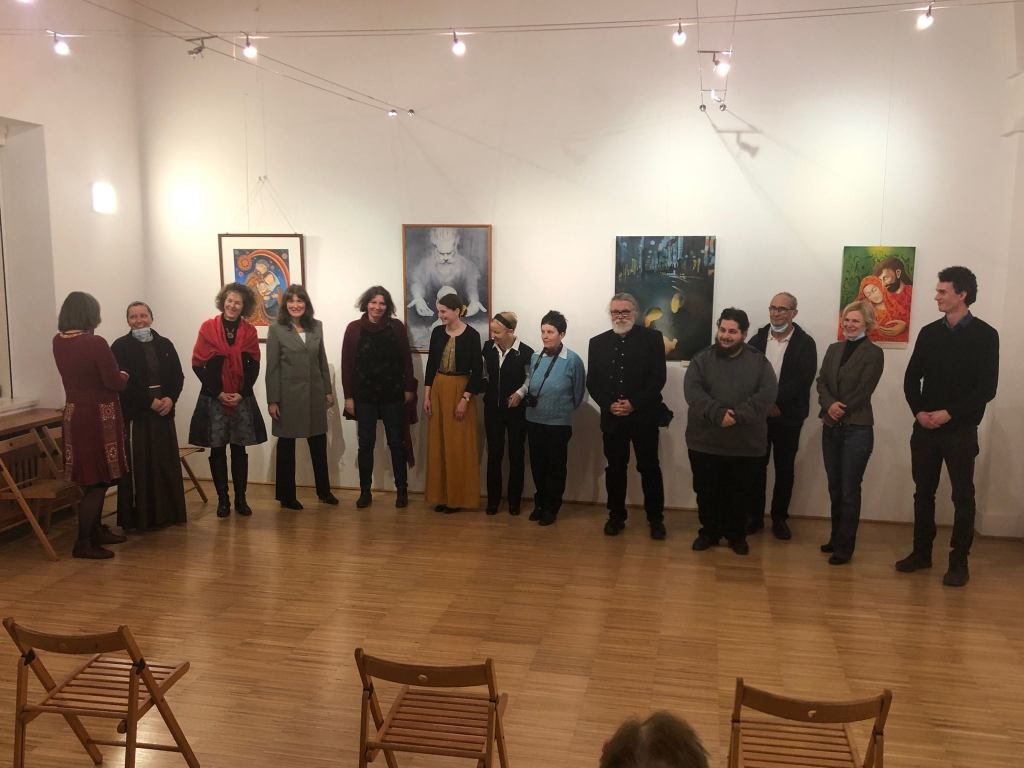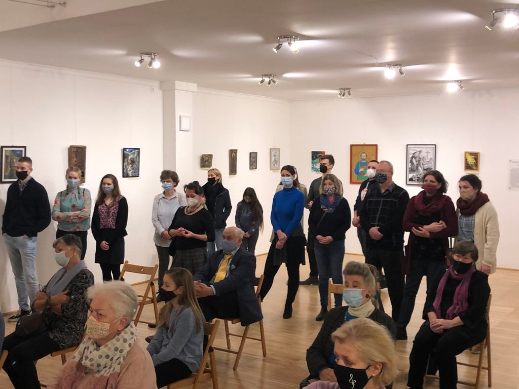 Este 6-ra megtelt a frissen felújított Szent József Ház nagyterme, sokan gyűltünk össze. 20-ból 13 alkotó is jelen volt, ami nagy öröm számunkra, köszönet részvételükért és a rendelkezésre bocsátott alkotásokért. Köszönet dr. Martos Levente Balázs atyának is, jelenlétéért, a megnyitóbeszédében kibontott lélekemelő, mély és motiváló, továbbmutató gondolatokért, a személyes hangú kép-ajánlókért, megosztásokért. A zenei közreműködőknek – Pethő Rebekának és Pethő Csabának, a Sybliosis duónak – a fuvolán, gitáron megszólaltatott zeneművekért. A Magyar Kurir és a Katolikus Rádió munkatársainak a fotókért, riportokért.