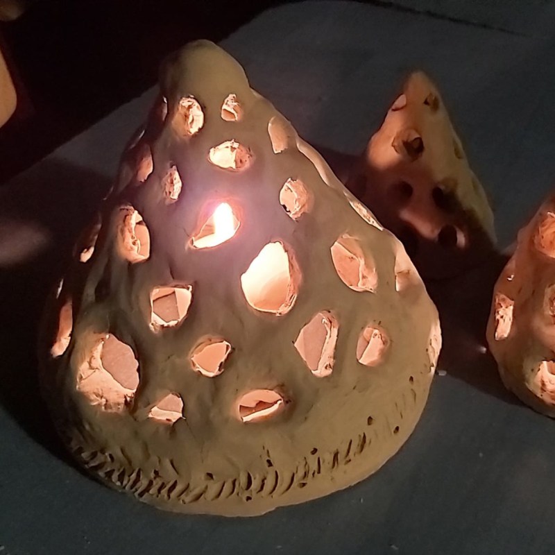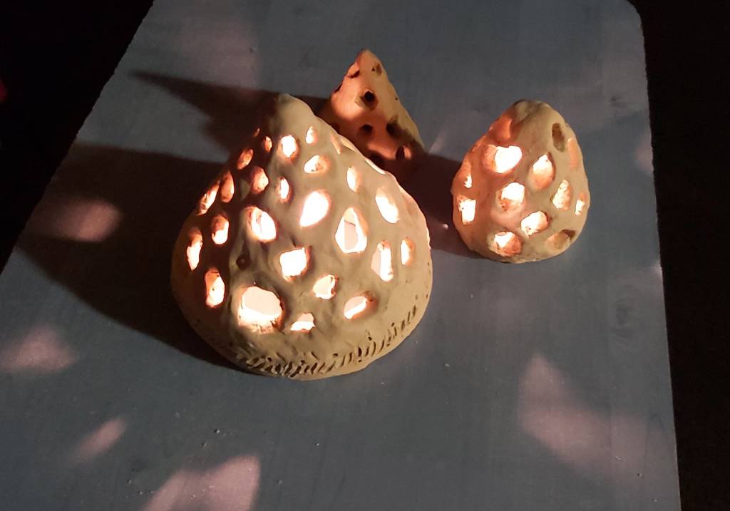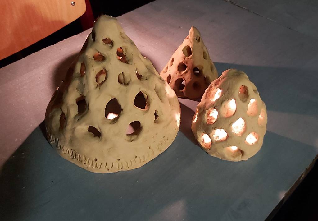 Márton nap tiszteletére újabb fények gyúltak – tanítványaim mécsesei (mécsespróba). Megszerettük ezt a különös formát, most fényes állapotában jöttem rá, hogy gombára is hasonlít (eddig termések, toboz, szivacsok, kagyló, mészkő, kaptár merültek fel).