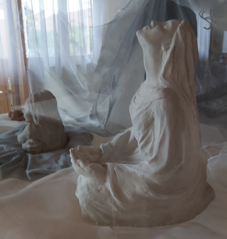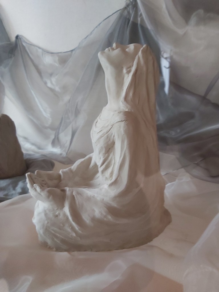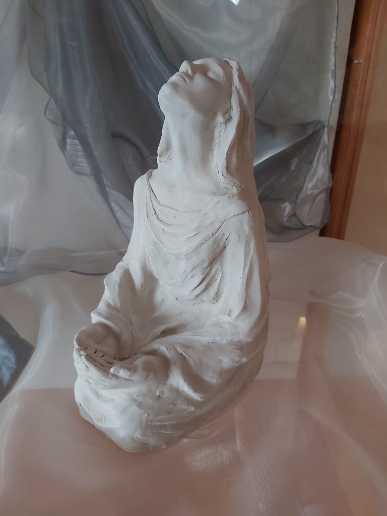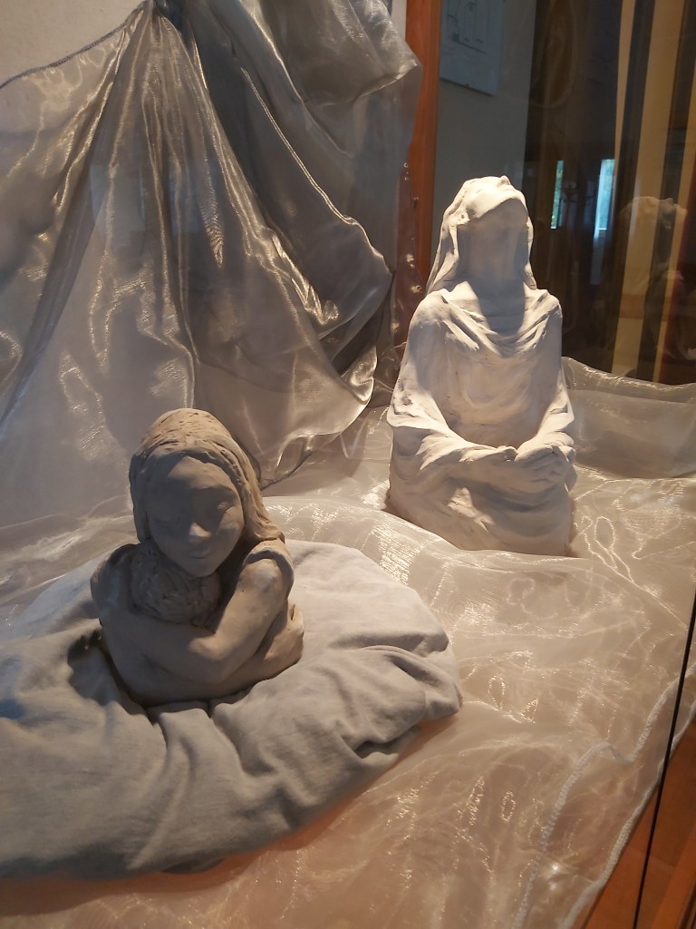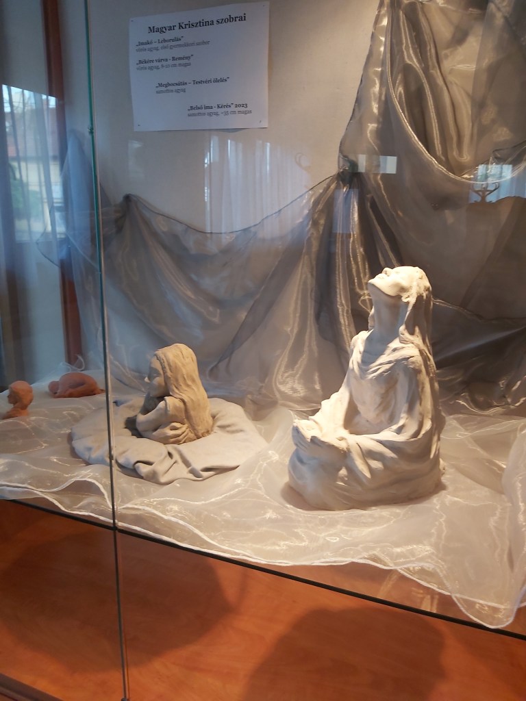 Ma egyik gyermekemmel megnéztük a csillaghegyi kiállítást. Délutáni fények voltak, még nem égtek a lámpák. A szűrt fény és az üveg tükröződései sejtelmesebbé tették a szobrokat a vitrinben. Később felkapcsolták a vitrin belső lámpáját, ami drámaibb jelleget adott a formáknak, kontrasztosabb fény-árnyékokat. Mennyi árnyalat! Mennyi arc, más és más jelleg! Sokat fotóztam. Később vettem észre: néhány képen mintha lebegne a nagyobb, már fehér szobor. A másik, a kisebb pedig színváltásba kezdett: elkezdett világosodni – ahogy szárad, úgy fehéredik folyamatosan. Mintha élne, változik. Még pár nap, és megszűnik a tónuskülönbség a két nagyobb szobor között, a samottos alapanyag miatt lassacskán a kisebbik is teljesen fehér lesz. Érdemes élőben megtapasztalni 🙂…! Bp. III. Mátyás király út 13- 15. Csillaghegyi Közösségi Ház. (Köszönöm, ha reflektáltok a Vendégkönyvben gondolataitokról.)