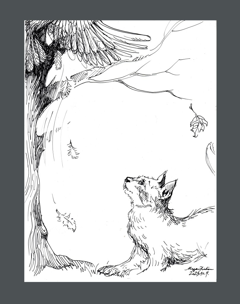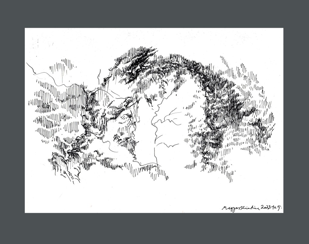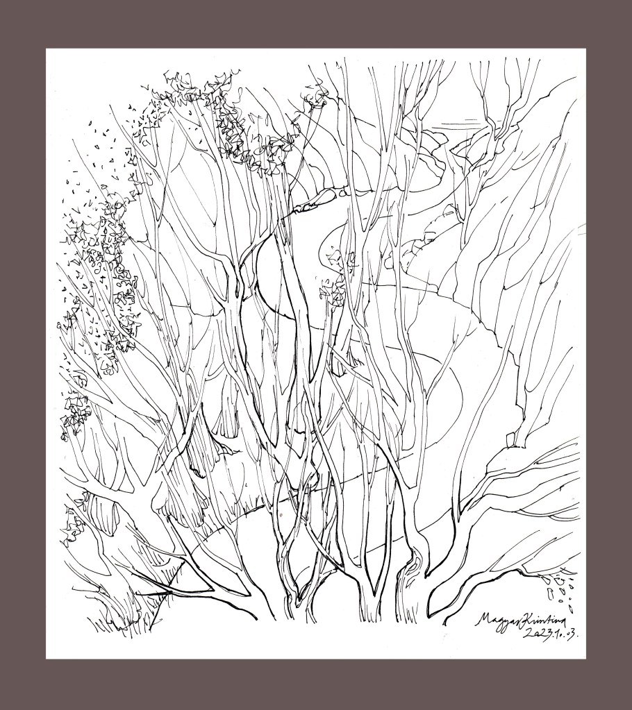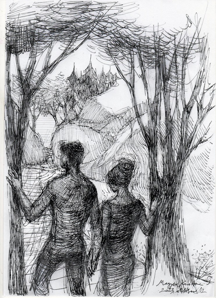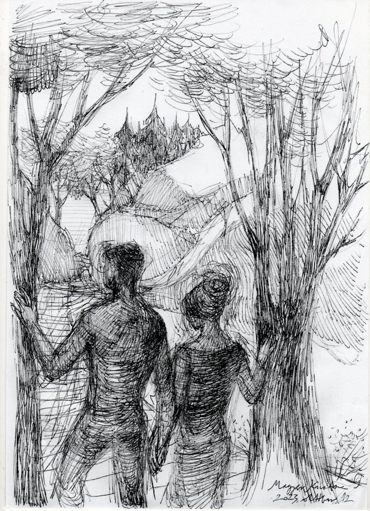 A “Wander” – “Vándorlás” témára kettőt teszek fel: az egyik csak kézi, a másik gépi segítséget is igénybe-vevő változat. A kézi szerintem légiesebb, mesésebb. A gépi meg kisimítottabb, egyszerűbb. A képnél sok változat után választottam ezt a verziót (volt csak természet, volt egyvalaki vadonban, volt fűzfaágak közül kinéző stb.). Azért szeretem, mert benne van az út, a távlat, a “ketten”, vagyis az együtt vándorlás, ami jó, benne van az árnyékból a fény felé – még ha elég izgalmasnak is tűnik, ami rájuk vár. Jó, hogy együtt vannak ebben. Szeretem, hogy az alakok keze is beszédes, egyikkel egymás kezét fogják, a másikkal egy-egy fát érintenek. Ők mennek, a fák maradnak. De egy pillanatra egyek. Mintegy kapuban állnak, mielőtt az útra lépnének.