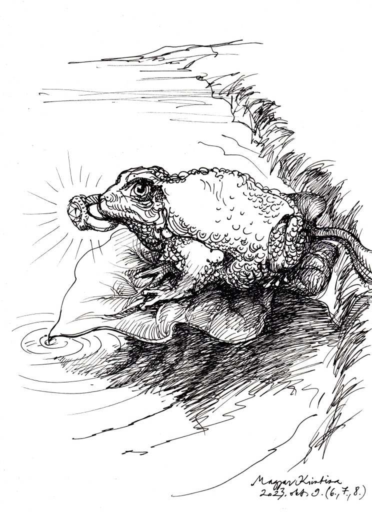 A követett napi témák (néha – idő híján – összevont módon egy rajzban, mint ahogy a 6.-9. szerintem időbeli előzményként vagy következményként mind ott van a varangyosban… de azért egy vízcseppeset még rajzoltam pluszban):