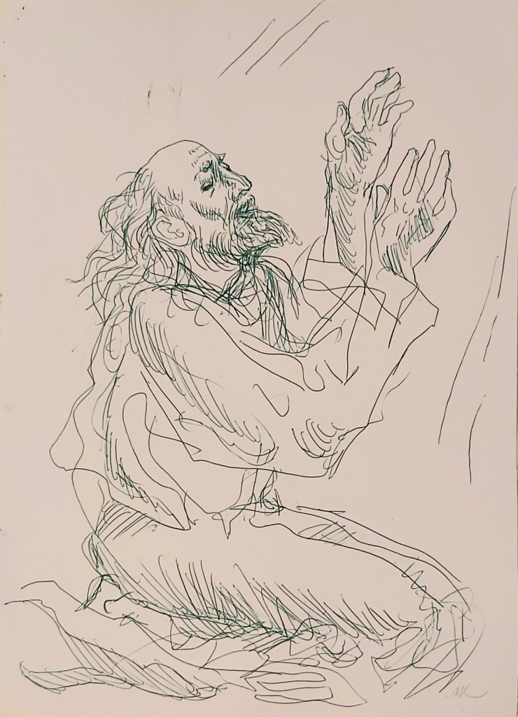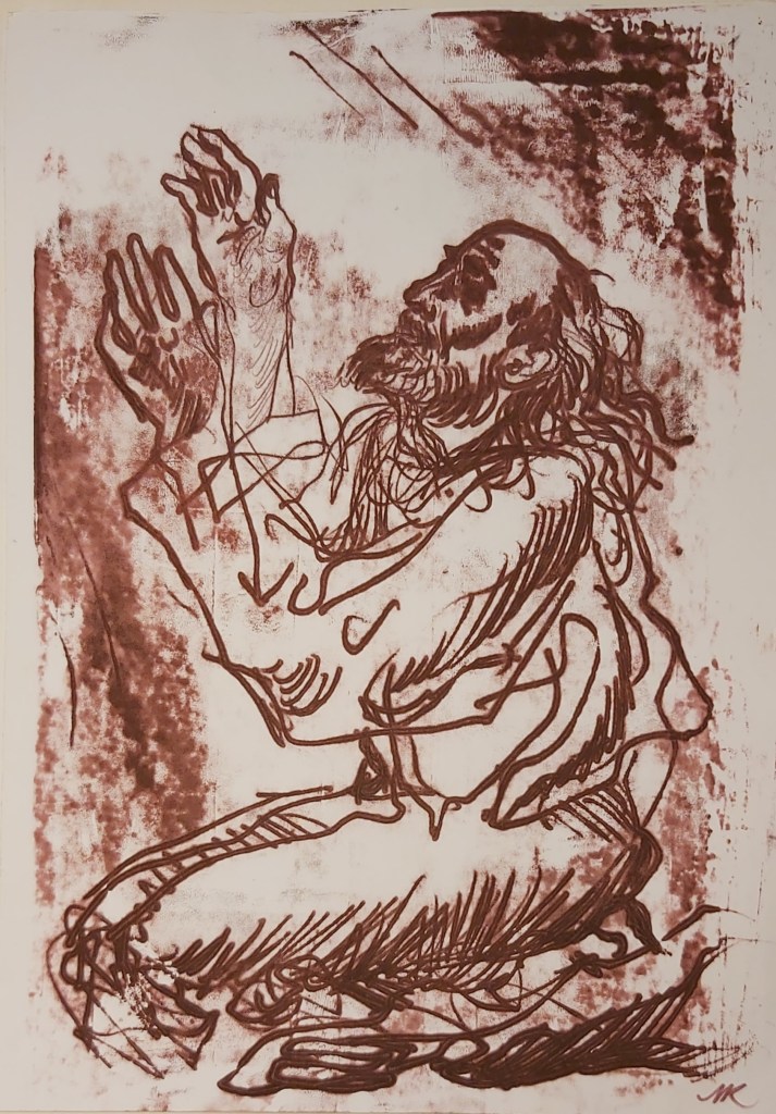 Néha be kell csukni a szemet, vagyis a “külső szemet” az elénk tülekedő “primér látnivalók” elől, hogy mélyebb síkon érzékeljünk. Ez a múlt év utolsó hónapjaiban készült gyors monotípia (szintén órai szemléltetés) talán lehetne a “Fény-fürdő” vagy az “Belső ima” című kép párja. Nem állítottuk ki, nem szerepelt sehol, de engem minden nap itt várt hazaérkezéskor az asztalom mellett. Prófétai alak, idősebb férfi fej, lecsukott szemek, fényár vagy megvilágosodás. Eszembe jutott róla Szent Pál is, aki leesve a lóról, megvakult, egy időre elvesztette a szeme világát, de egyúttal – belső vagy benső értelemben – megkapott egy sokkal valóságosabb látást, a földi életen is átragyogó, belső fényt, egy olyan, “másik világosságot”, ami “megfordította”. A felemelt kezek lehetnek akár a vágyódás és keresés, akár a revelációból ébredő magasztalás és dicsőítés, de a nyomorúságból-szükségből segítségért kinyúlás kezei is – milyen jó, hogy ennyiféle gesztust kifejezhetnek kezeink.