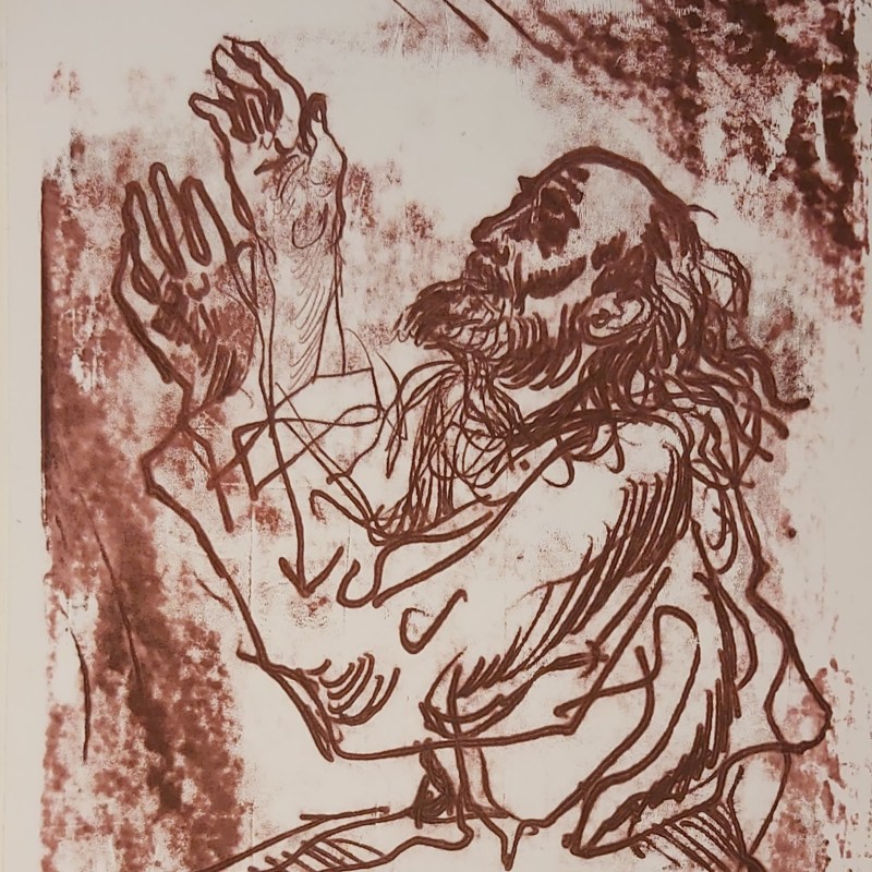 Néha be kell csukni a szemet, vagyis a “külső szemet” az elénk tülekedő “primér látnivalók” elől, hogy mélyebb síkon érzékeljünk. Ez a múlt év utolsó hónapjaiban készült gyors monotípia (szintén órai szemléltetés) talán lehetne a “Fény-fürdő” vagy az “Belső ima” című kép párja. Nem állítottuk ki, nem szerepelt sehol, de engem minden nap itt várt hazaérkezéskor az asztalom mellett. Prófétai alak, idősebb férfi fej, lecsukott szemek, fényár vagy megvilágosodás. Eszembe jutott róla Szent Pál is, aki leesve a lóról, megvakult, egy időre elvesztette a szeme világát, de egyúttal – belső vagy benső értelemben – megkapott egy sokkal valóságosabb látást, a földi életen is átragyogó, belső fényt, egy olyan, “másik világosságot”, ami “megfordította”. A felemelt kezek lehetnek akár a vágyódás és keresés, akár a revelációból ébredő magasztalás és dicsőítés, de a nyomorúságból-szükségből segítségért kinyúlás kezei is – milyen jó, hogy ennyiféle gesztust kifejezhetnek kezeink.