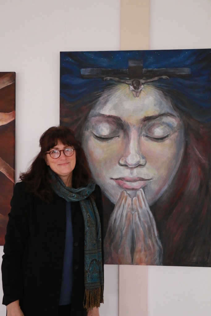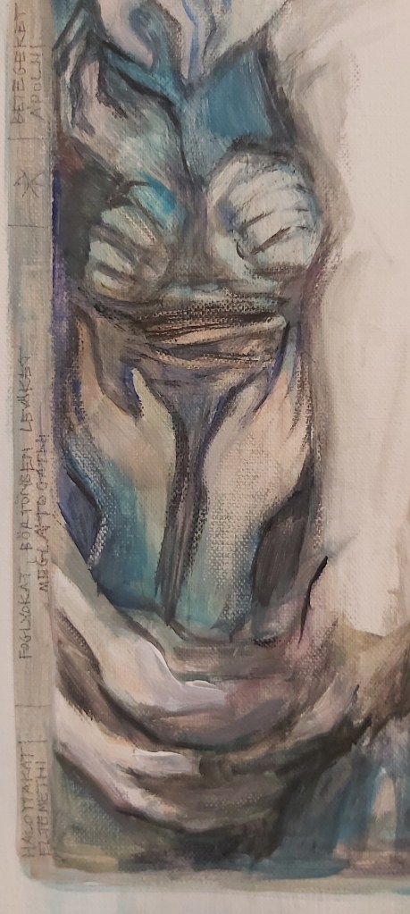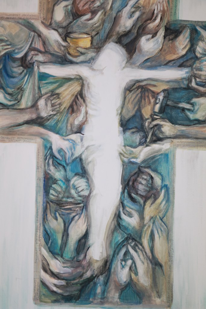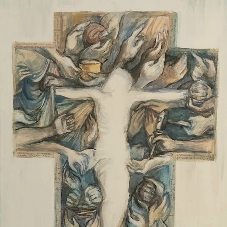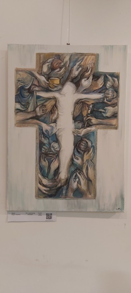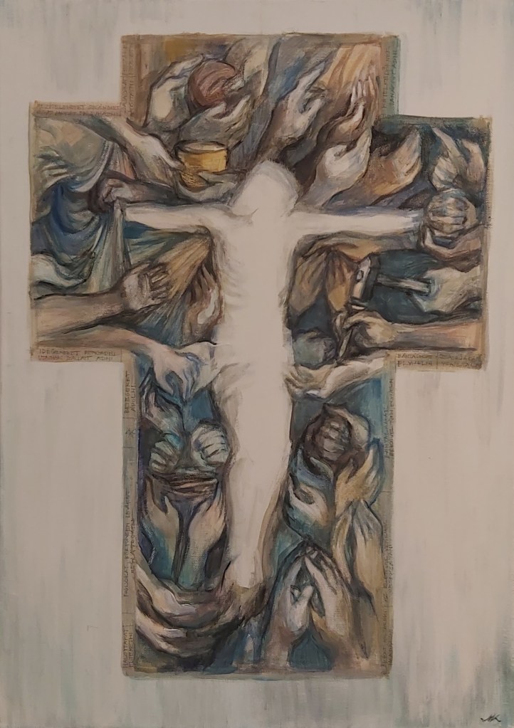 Új – vagy inkább régi-új – képként erre a kiállításra egy bennem több évvel ezelőtt megfogalmazódott gondolatot festettem meg újra, most már nagyobb méretben: az “Irgalmasság keresztje” című képemet. Szükséges volt. (Eddig grafikáim, kisméretű (A4-es) vegyes technikájú feldolgozásaim születtek ezzel a címmel, most 50×70-es vászonra dolgoztam akrillal.) A kezdeti gondolat – az irgalmasság testi és lelki cselekedeteinek kezekkel, gesztusokkal történő ábrázolása, egy körvonalaiban jelen lévő, mégis mintegy hiányzó corpus, Krisztus-test körül – az elmúlt hónapokban átélt közeli veszteségek miatt új jelentéstartalmat kapott. Eredetileg azt jelentette számomra a “hiányzó test” illetve az inverz jelleg, hogy Jézus Krisztus mai földi jelenlétének kulcsa – kereszthalála, feltámadása és mennybemenetele óta – a ma Benne hívő, itt élők közössége. Mi vagyunk azok, akik ma is élő módon megjeleníthetjük szeretetét, méghozzá legfőképpen az irgalmasság cselekedetei által: éhezőnek enni, szomjazónak inni, ruhátlannak (szegénynek) öltözéket adni, betegeket és rabokat ápolni-meglátogatni, halottakat eltemetni (…). Ezekre utal az Evangélium az utolsó ítéletről szóló példabeszédnél, a “legkisebbekkel”, mint az “Emberfiával” megcselekedhető jókkal. Mt 25,31-46. Egyenlőségjel van: Vele tesszük (vagy nem tesszük). Ezáltal testesül meg ma Krisztus, köztünk. Így lehet Isten minden mindenben, adóban és elfogadóban is ugyanúgy.