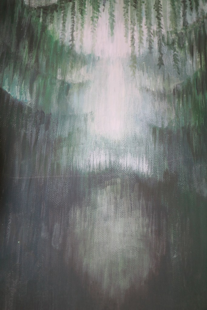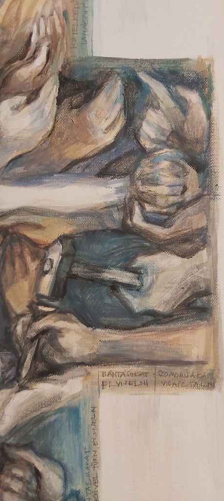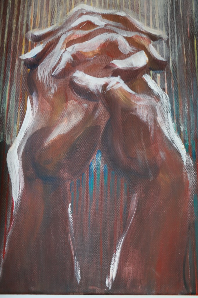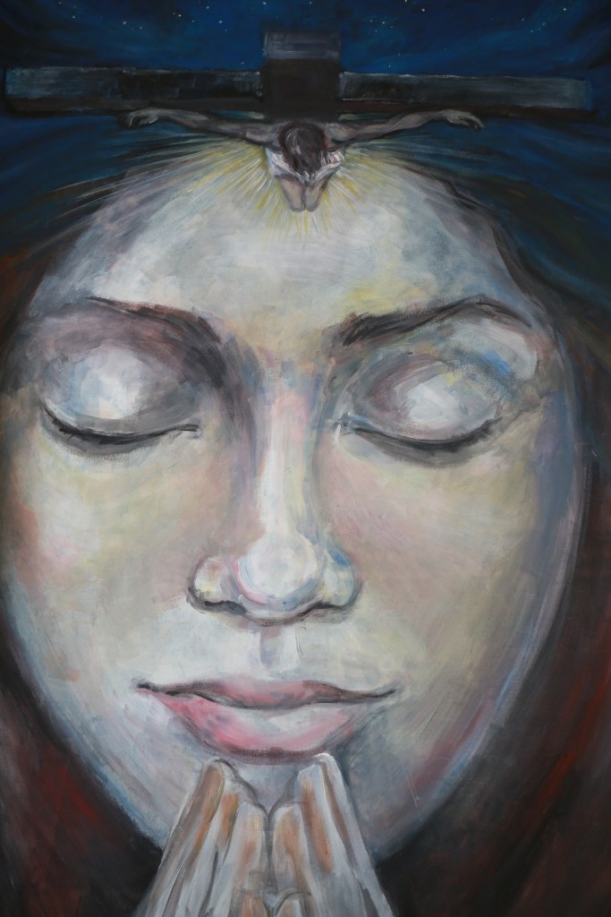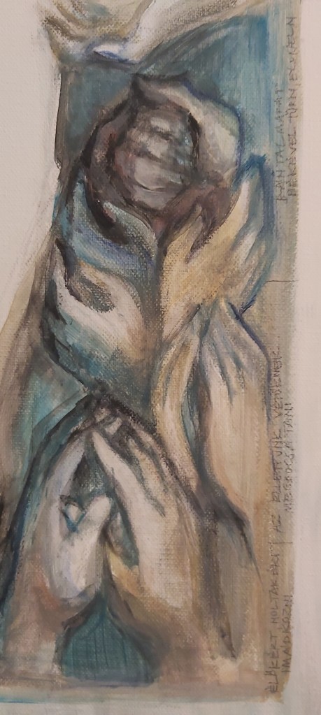 Új – vagy inkább régi-új – képként erre a kiállításra egy bennem több évvel ezelőtt megfogalmazódott gondolatot festettem meg újra, most már nagyobb méretben: az “Irgalmasság keresztje” című képemet. Szükséges volt. (Eddig grafikáim, kisméretű (A4-es) vegyes technikájú feldolgozásaim születtek ezzel a címmel, most 50×70-es vászonra dolgoztam akrillal.) A kezdeti gondolat – az irgalmasság testi és lelki cselekedeteinek kezekkel, gesztusokkal történő ábrázolása, egy körvonalaiban jelen lévő, mégis mintegy hiányzó corpus, Krisztus-test körül – az elmúlt hónapokban átélt közeli veszteségek miatt új jelentéstartalmat kapott. Eredetileg azt jelentette számomra a “hiányzó test” illetve az inverz jelleg, hogy Jézus Krisztus mai földi jelenlétének kulcsa – kereszthalála, feltámadása és mennybemenetele óta – a ma Benne hívő, itt élők közössége. Mi vagyunk azok, akik ma is élő módon megjeleníthetjük szeretetét, méghozzá legfőképpen az irgalmasság cselekedetei által: éhezőnek enni, szomjazónak inni, ruhátlannak (szegénynek) öltözéket adni, betegeket és rabokat ápolni-meglátogatni, halottakat eltemetni (…). Ezekre utal az Evangélium az utolsó ítéletről szóló példabeszédnél, a “legkisebbekkel”, mint az “Emberfiával” megcselekedhető jókkal. Mt 25,31-46. Egyenlőségjel van: Vele tesszük (vagy nem tesszük). Ezáltal testesül meg ma Krisztus, köztünk. Így lehet Isten minden mindenben, adóban és elfogadóban is ugyanúgy.