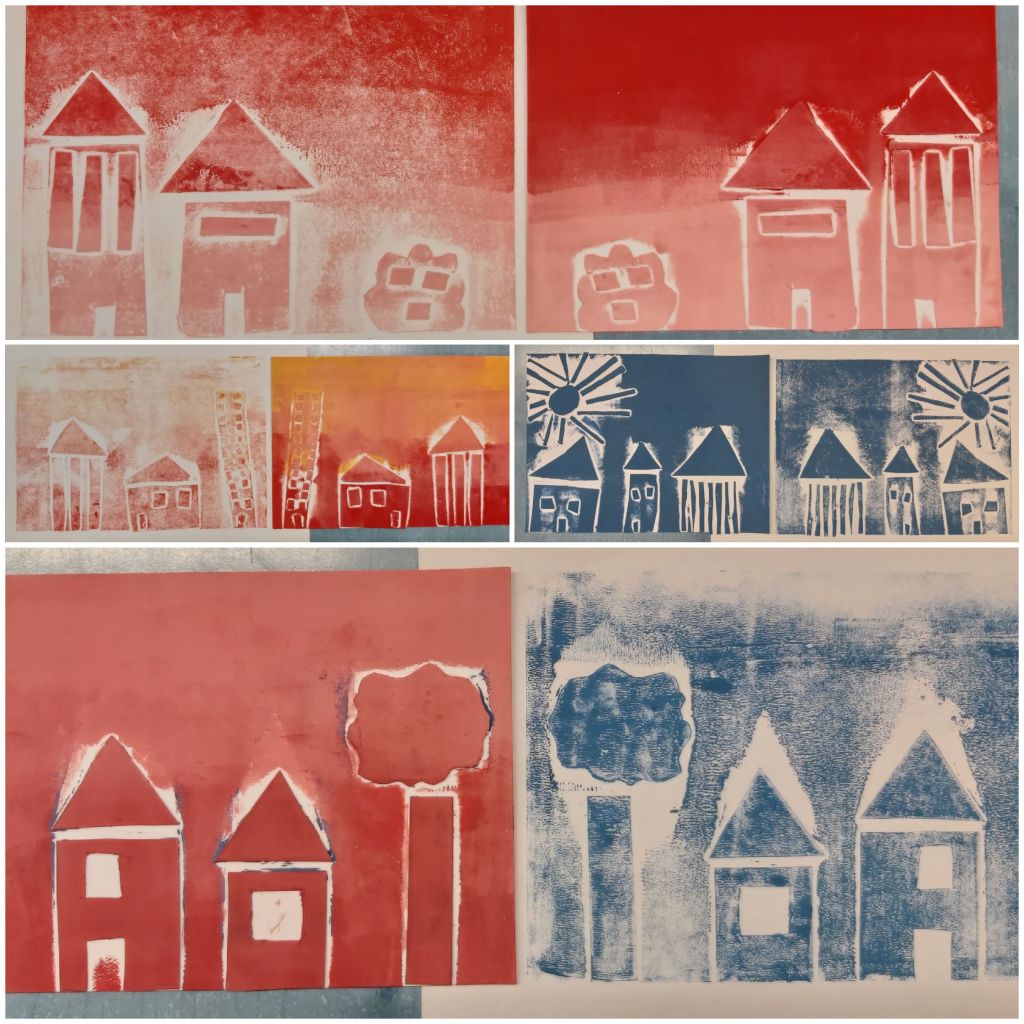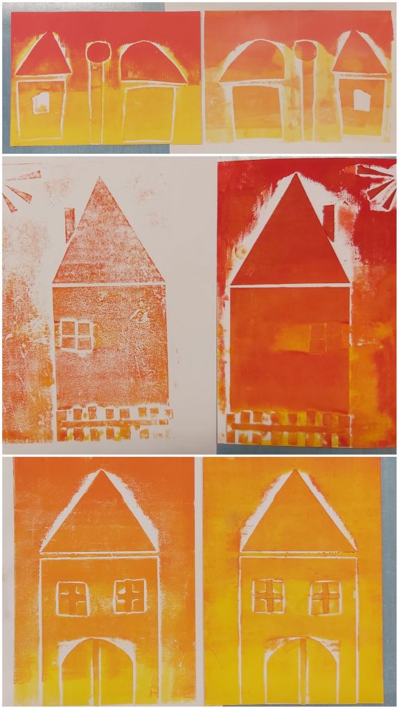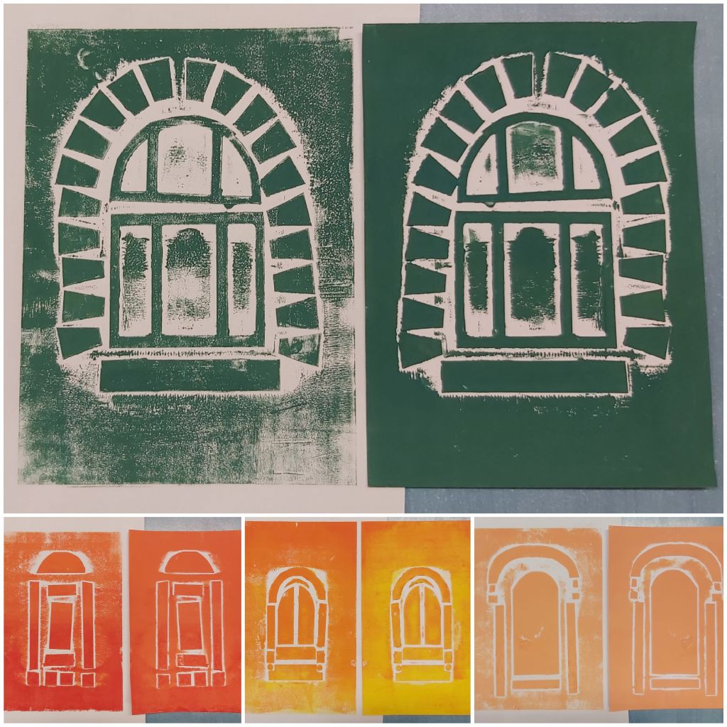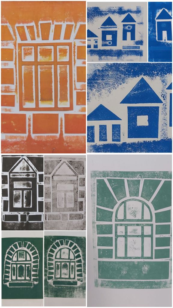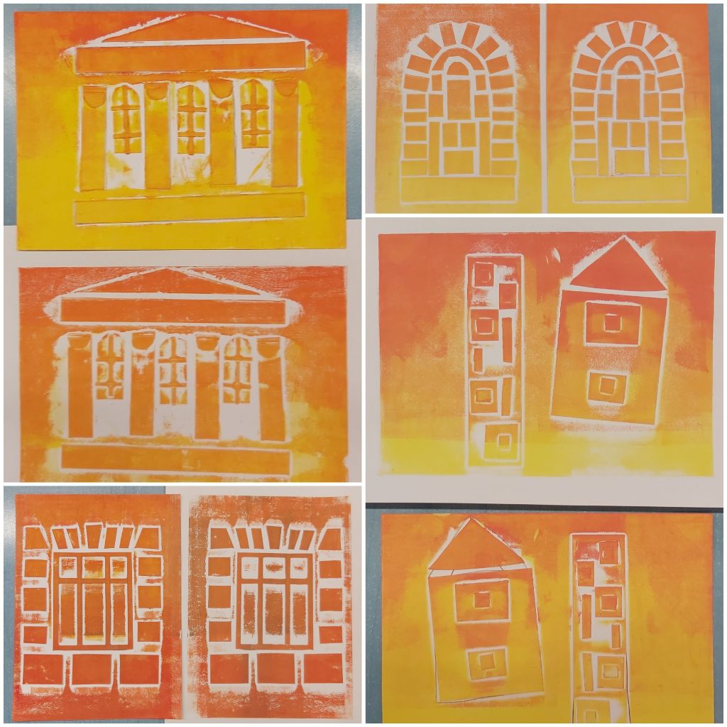Az Aelia Sabina Művészeti Iskola-beli tanítványaimmal csinálok egy városos projektmunkát, itt tart most. Egészen kicsiktől a nagyobbacskákig (7-8 évestől 14-15 évesig) készítettek-készítenek papírmetszetet ház-portál-homlokzatrészlet témában. Akinek nagyon nem ment az épített környezet, élőt is választhatott: fát, kutyát… Íme a dúcok és a nyomatok. Élvezték, főleg a színkeverést és sajátkezű nyomtatást!