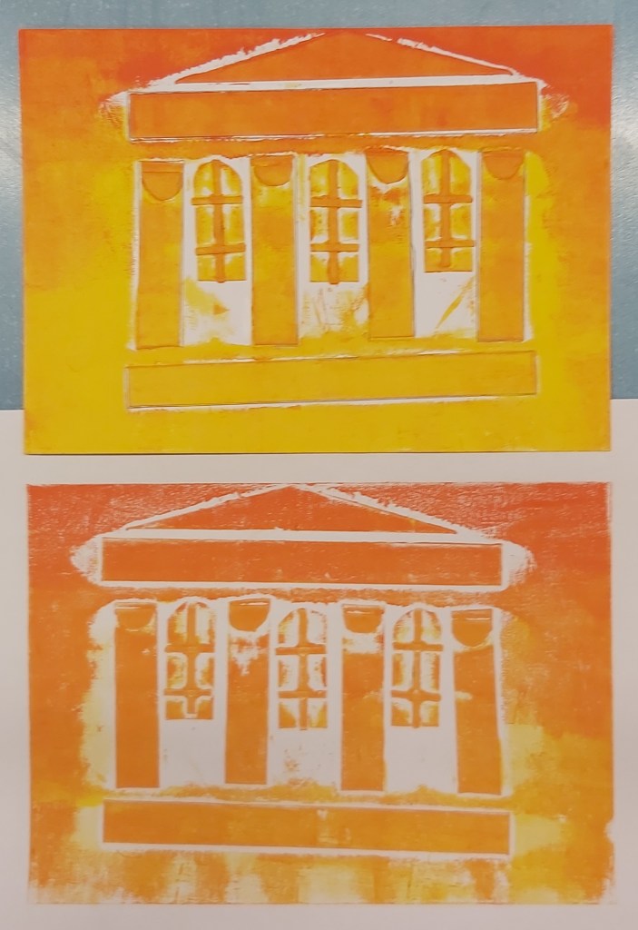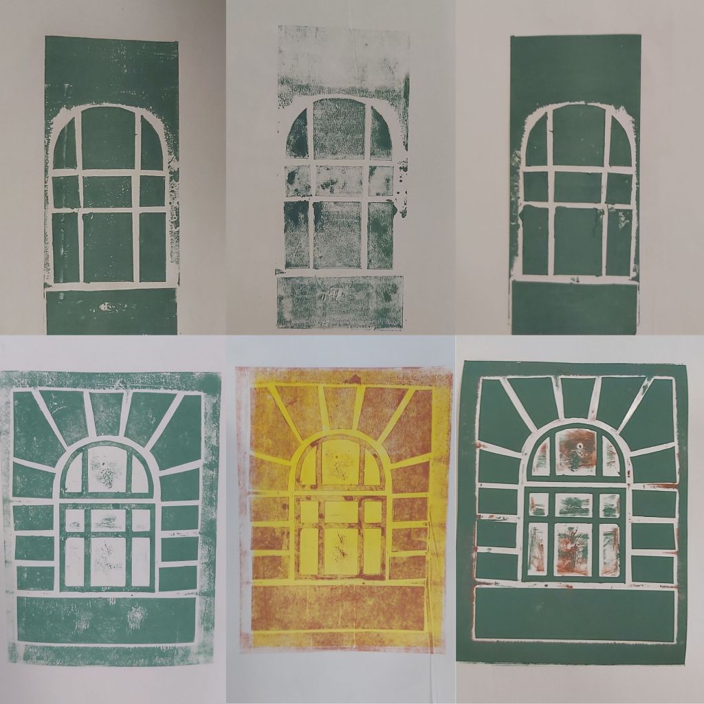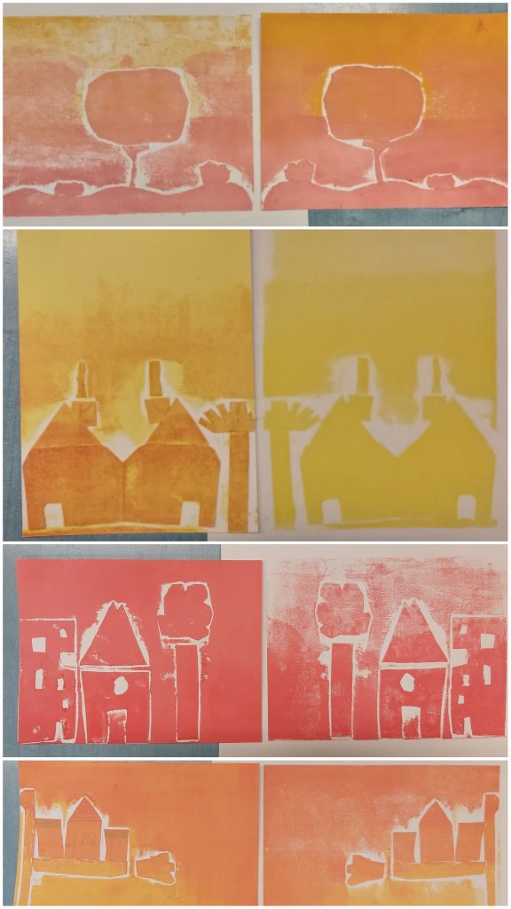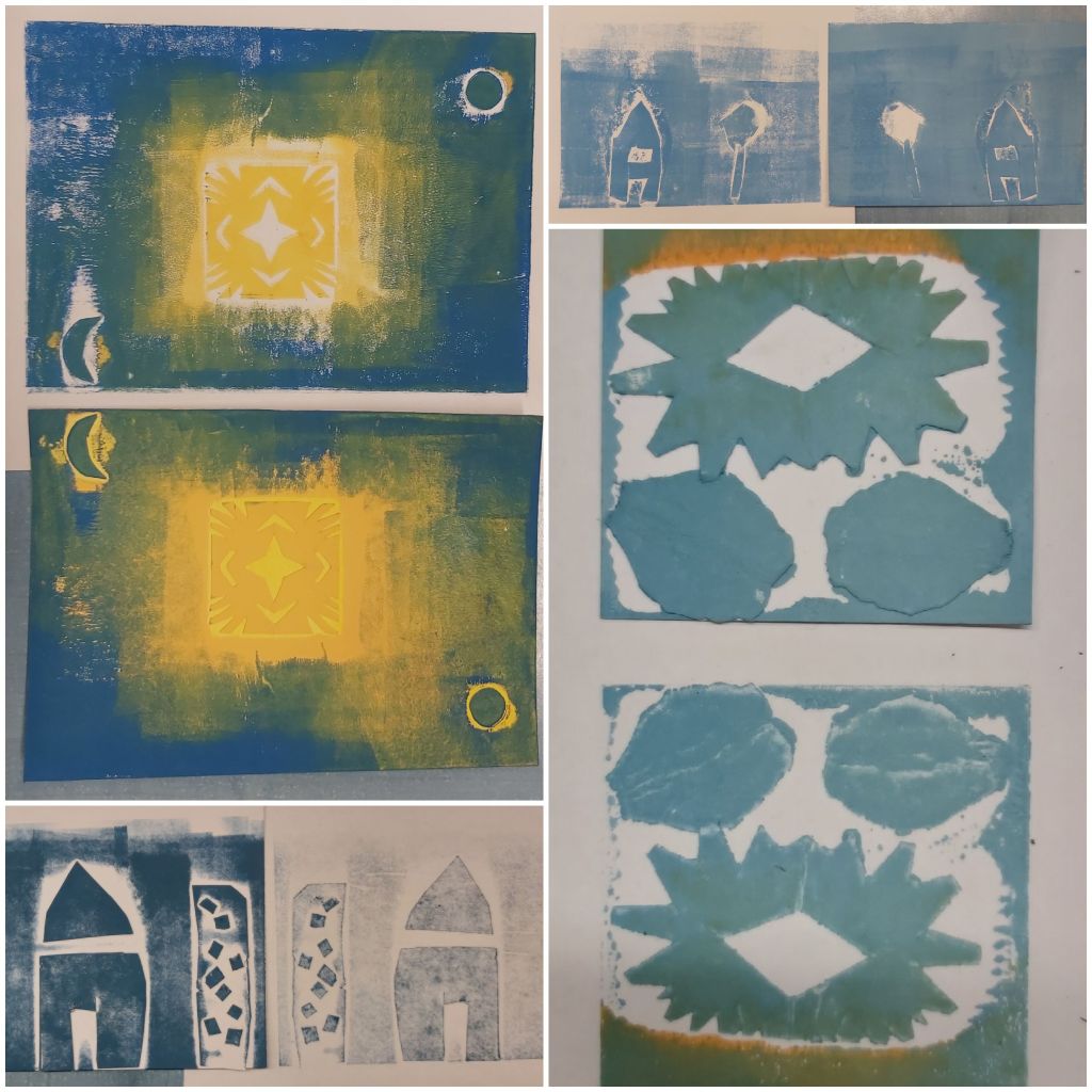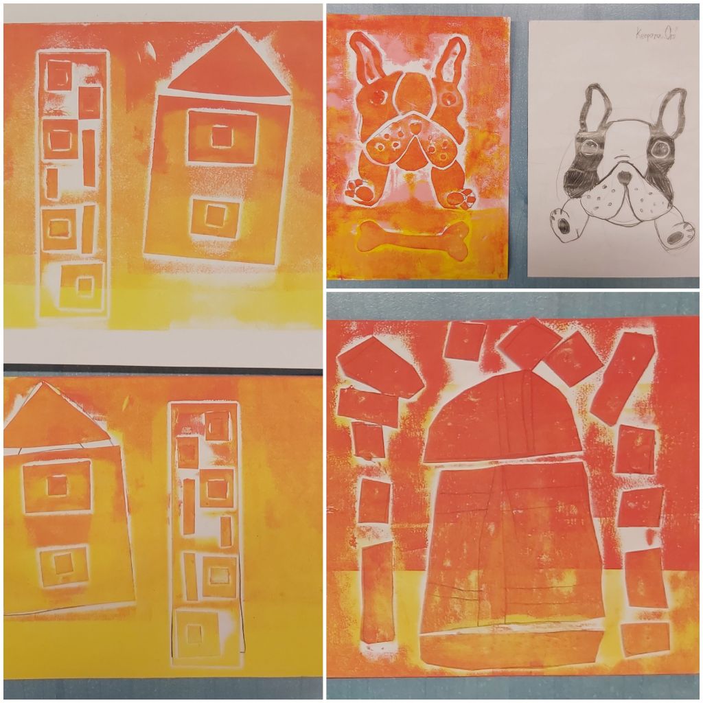Az Aelia Sabina Művészeti Iskola-beli tanítványaimmal csinálok egy városos projektmunkát, itt tart most. Egészen kicsiktől a nagyobbacskákig (7-8 évestől 14-15 évesig) készítettek-készítenek papírmetszetet ház-portál-homlokzatrészlet témában. Akinek nagyon nem ment az épített környezet, élőt is választhatott: fát, kutyát… Íme a dúcok és a nyomatok. Élvezték, főleg a színkeverést és sajátkezű nyomtatást!