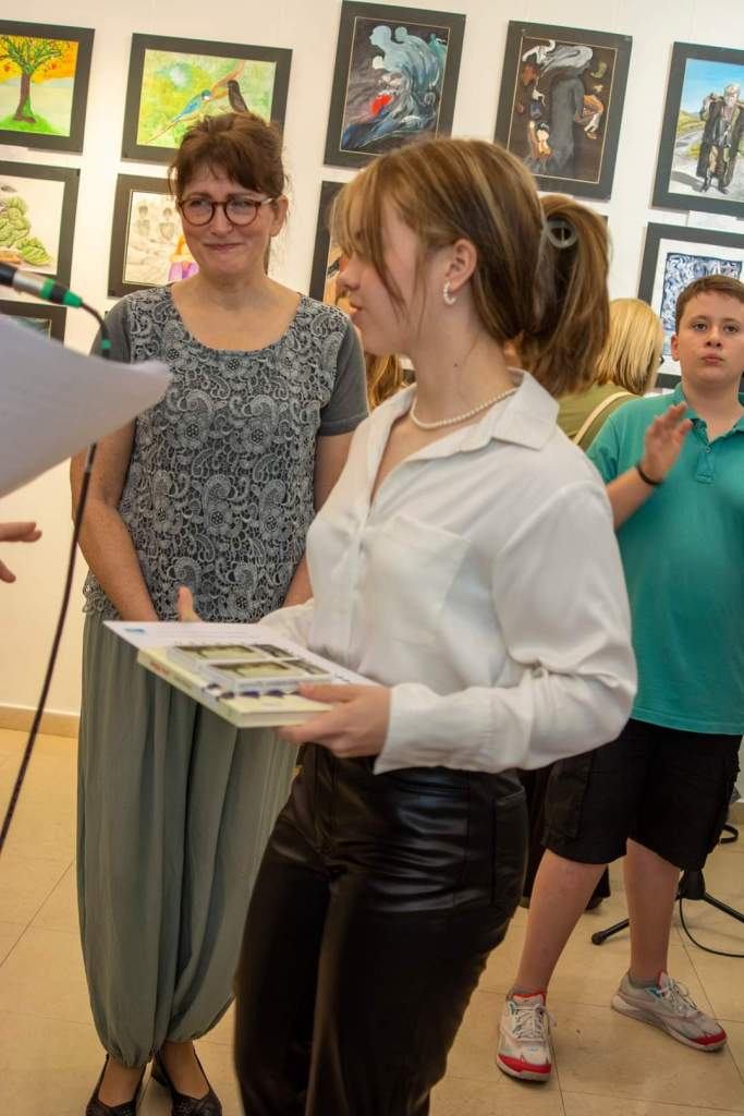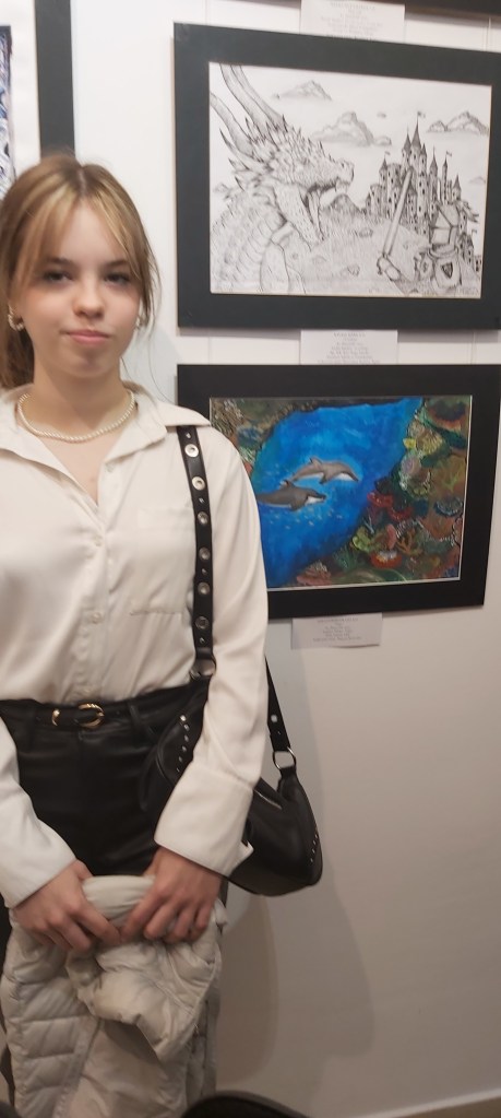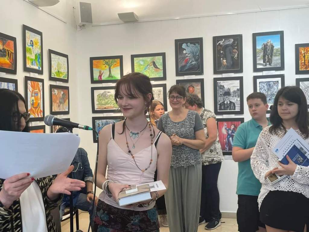 Ma a Ferencvárosi Helytörténeti Múzeum költészet-napi Fővárosi Versillusztrációs Pályázatának megnyitóján voltunk két díjazott tanítványommal, Kovács Enikő Andreával és Spiegelberger Lilivel. Enikő első, Lili második díjat nyert alkotásával. A versek, melyekhez készültek: Sipőcz Ildikó: Tenger (Lili), Juhász Gyula: Megölt szerelem sírköve (Enikő). A költészet napja kedves költőnk, József Attila születésnapja is egyben. Ünneplem, hogy ezek a művek is megszülethettek! Nagyon közel állnak hozzám. Büszke vagyok szeretett tanítványaimra, akiket kicsi koruk óta tanítgatok – jó látni a kibontakozásukat! Ajándék verseskönyvekkel és csokikkal, oklevelekkel távoztunk.