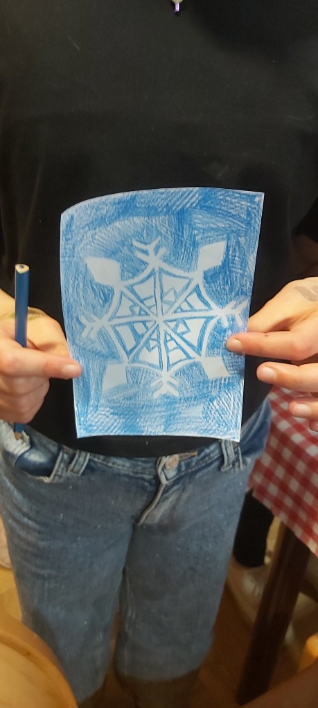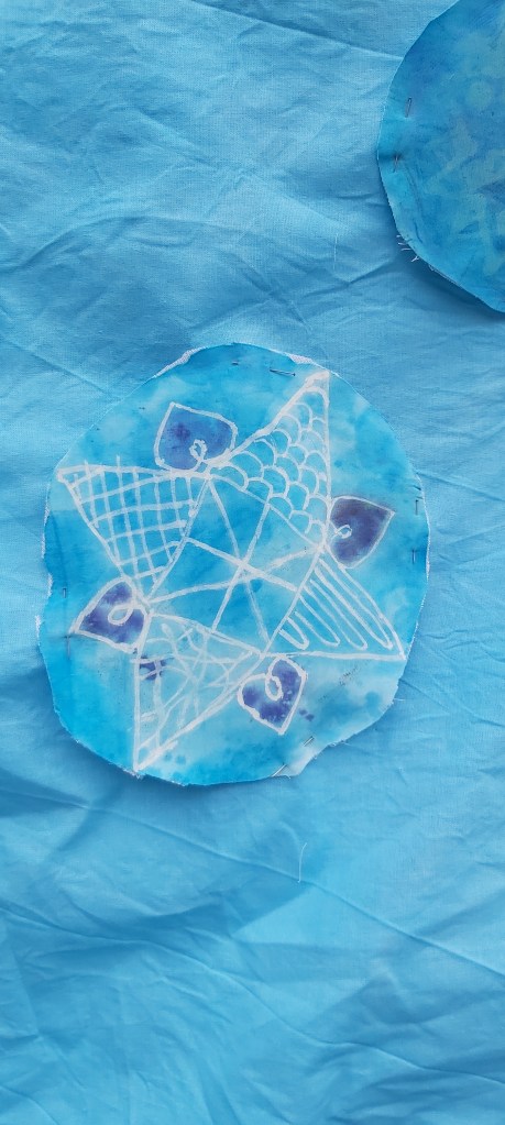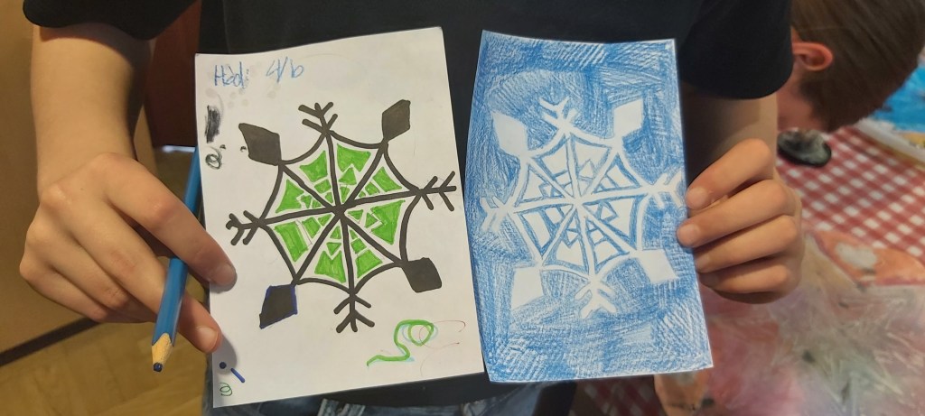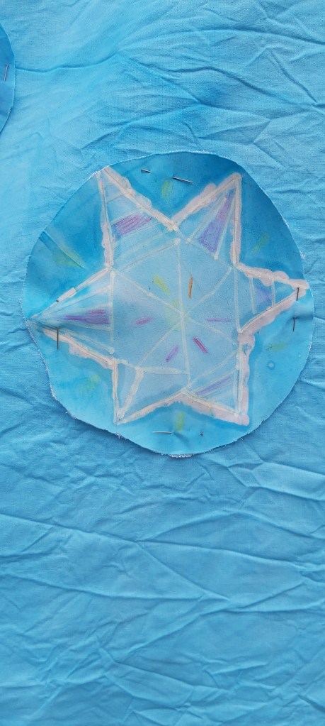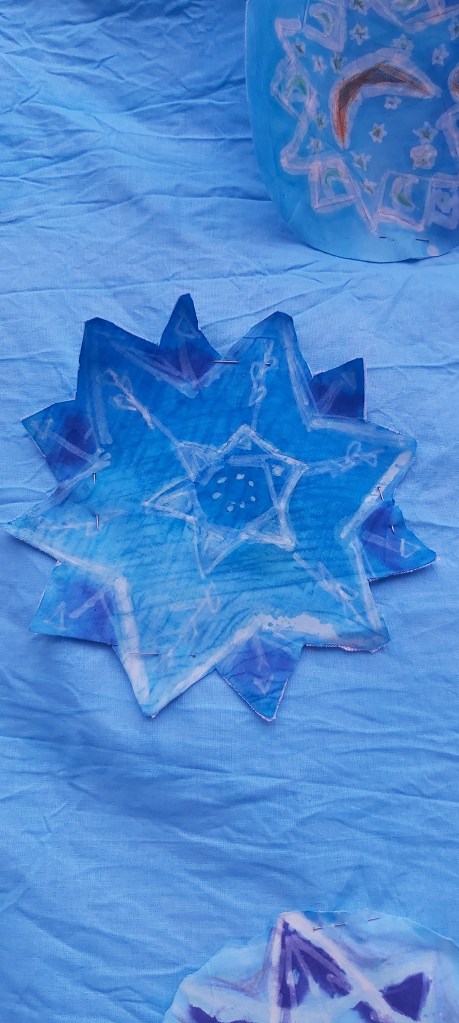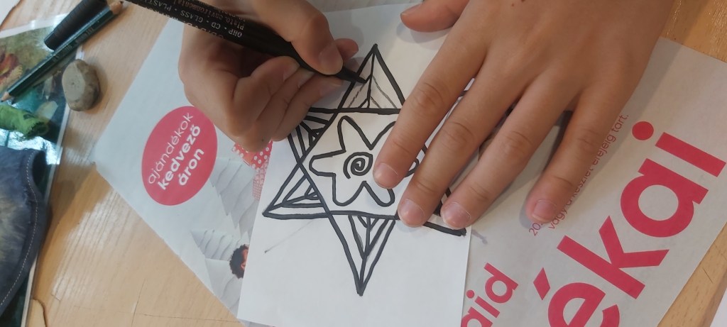 A batikolt csillagokra nagyon büszke vagyok, másodikos és negyedikes tanítványaim aznap készítették el vászonra, előzetes terveik szerint. Teszek fel néhány tervet is, mert gyönyörűek! Először vonalrajzot terveztek, majd inverz módon kontrasztosan színezték.