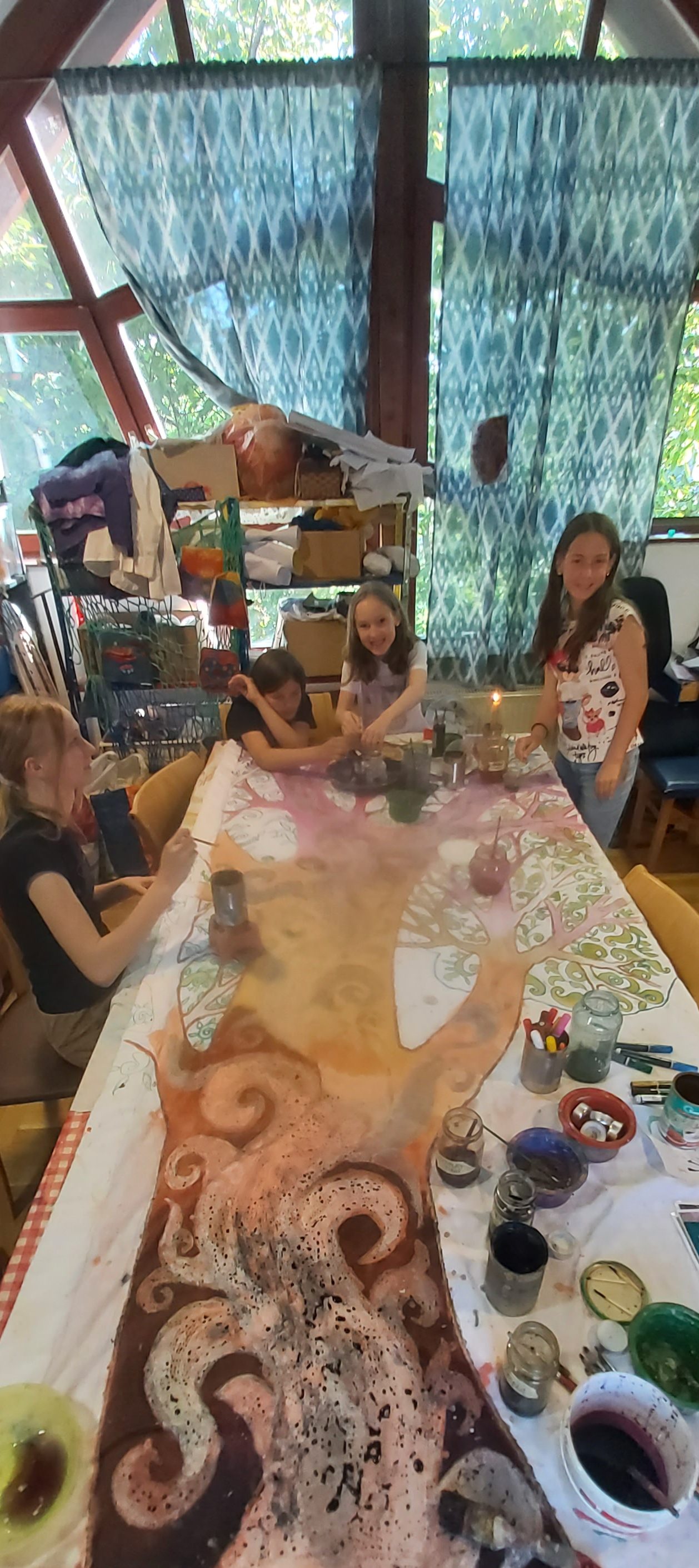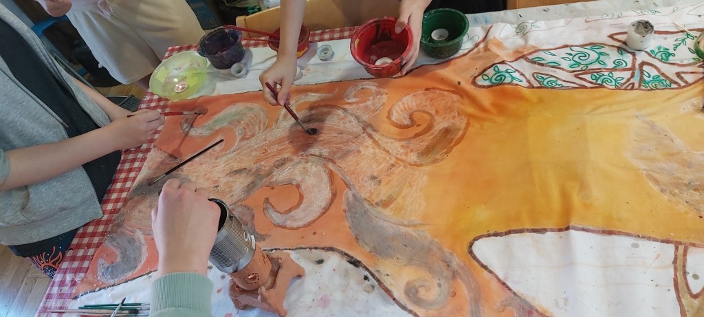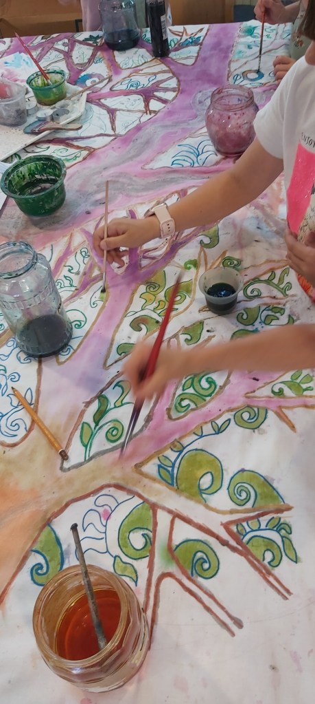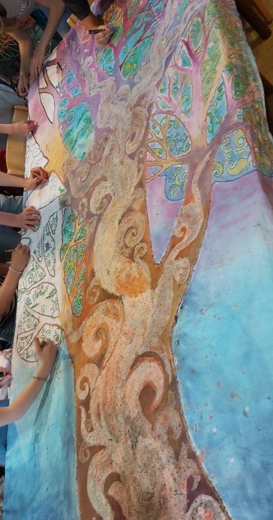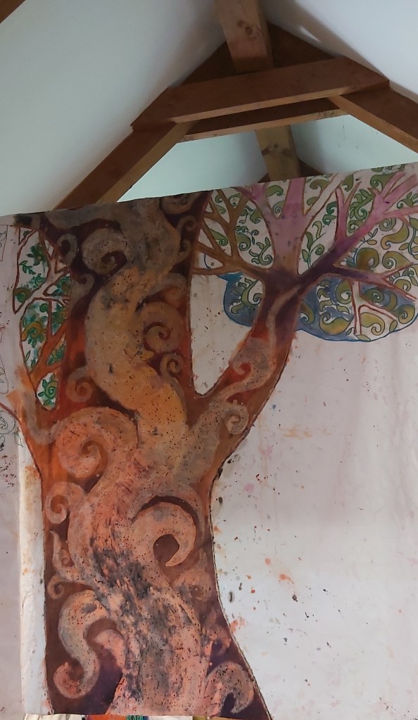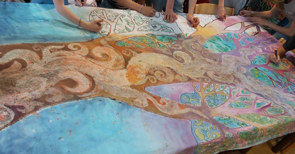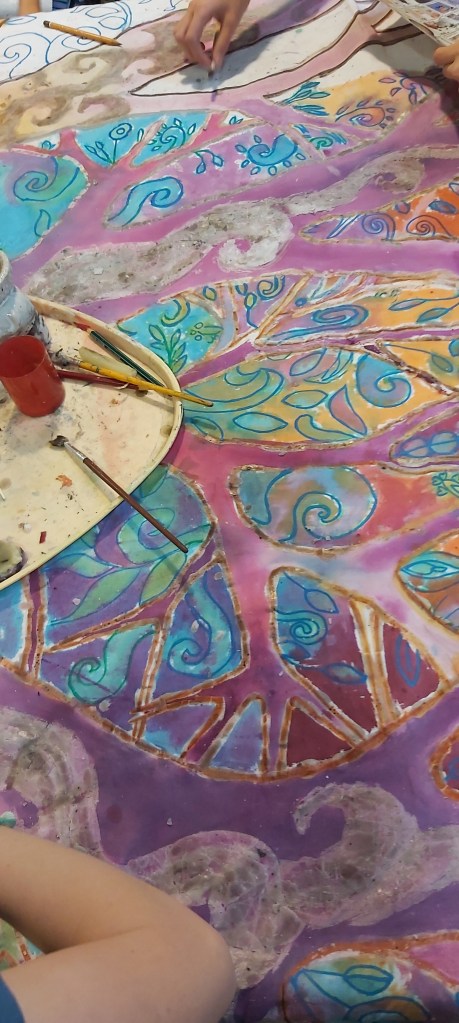 Nagy projektmunkába vágtunk idén az ürömi Művészeti Iskolában, együtt dolgozik rajta mindhárom képző/iparművészeti szakműhely, igazi összmunka, szépen alakul, bízunk benne, hogy gyönyörű lesz a végeredmény (június 7-én nyílik kiállításunk a szentendrei MANK galériában). Három színen három életképet jelenítünk meg objektekkel, bábokkal, valós és fikciós elemekkel, grafikai-festészeti, kerámia és textil technikákkal, úgy, hogy az egyes képek maguk is sokrétűek és komplexek, mintegy külön-külön kibontható történetek, rengeteg áthatással. Az egész egy összekapcsolódó, szép nagy egésszé áll majd össze reményeink szerint, az emberi életút különböző fázisaihoz kapcsolódva. Ma az általunk (textil műhely) készített batikolt fa-hátteret, ennek elkészülésének fázisait osztom meg, de még ezer osztható szépség lesz.