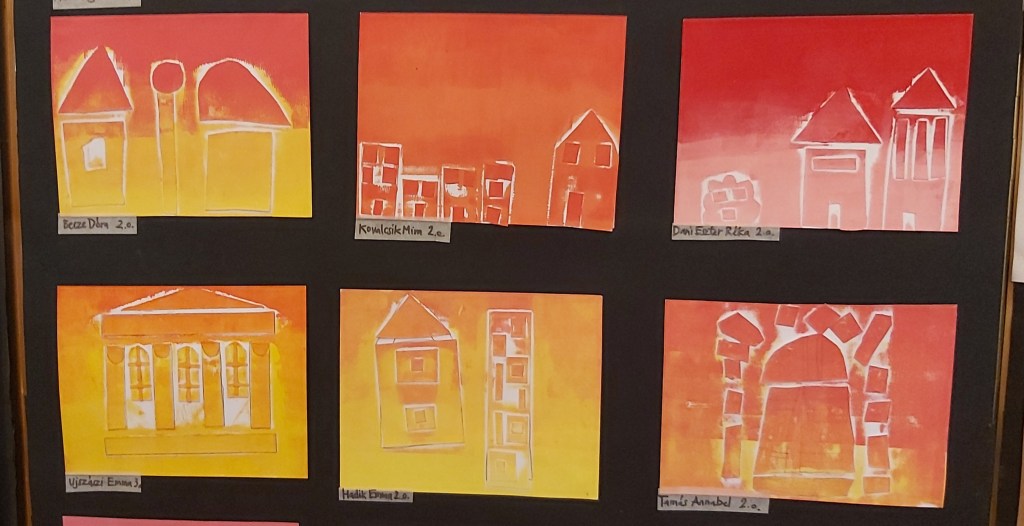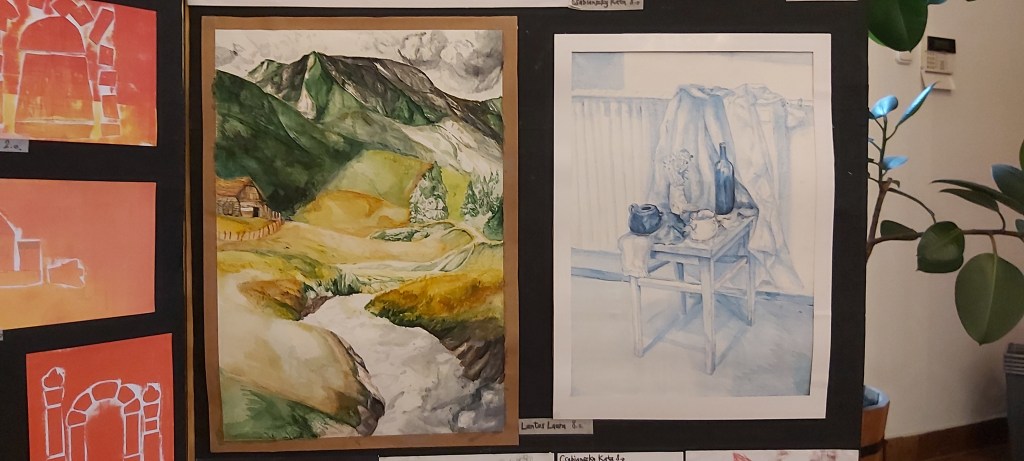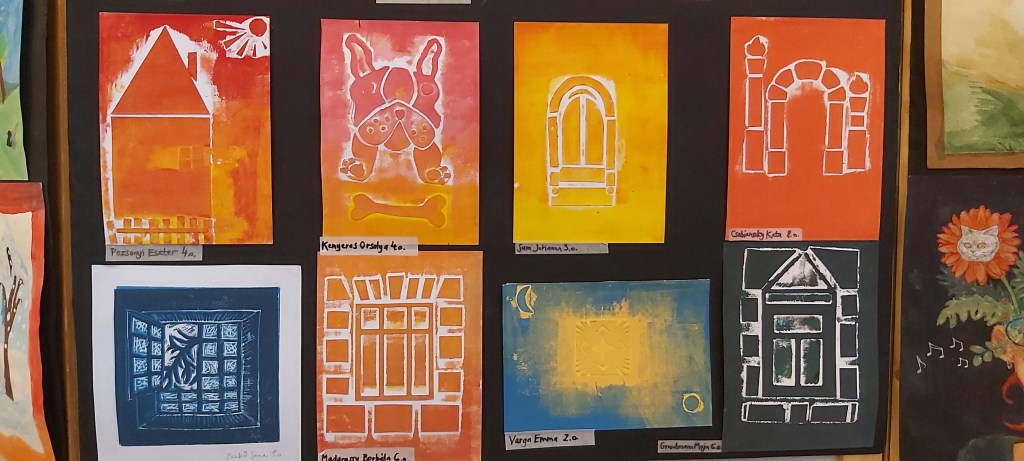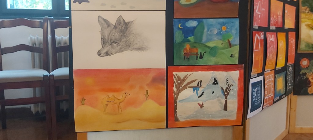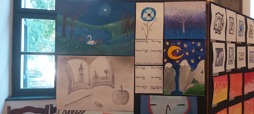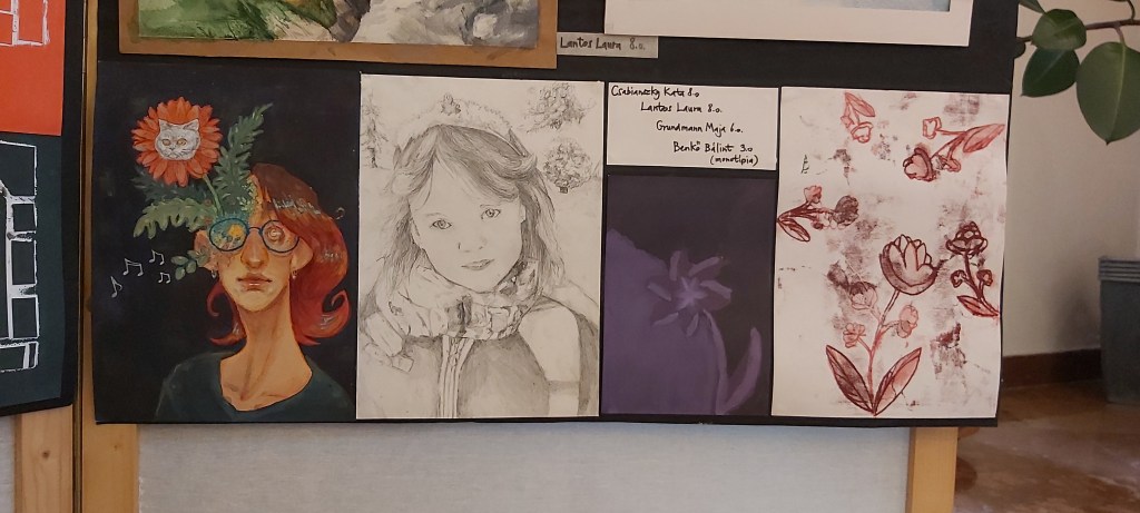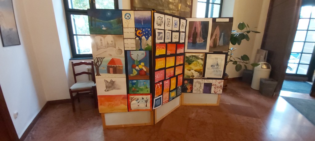 Ma Aeliás növendékeimmel részt vettünk az Óbudai Társaskörben megrendezett “Harrer-gálán”, készítettem néhány fotót az előtérben lévő kiállításunkról. Sok aelia-sabinás (művészeti) és egyúttal harreres (általános iskola) növendékem mutatkozik be ezen az estén, zenei vagy képzőművészeti plusz tartalmakkal, igazán örömteli alkalom! Nagyon ügyesek! Három paravánnyi anyaggal mutatkozhattunk meg, igyekeztem azokat a munkákat is kitenni, amelyek nem fértek ki az évvégi kiállításunkon az ÓKK-ban.