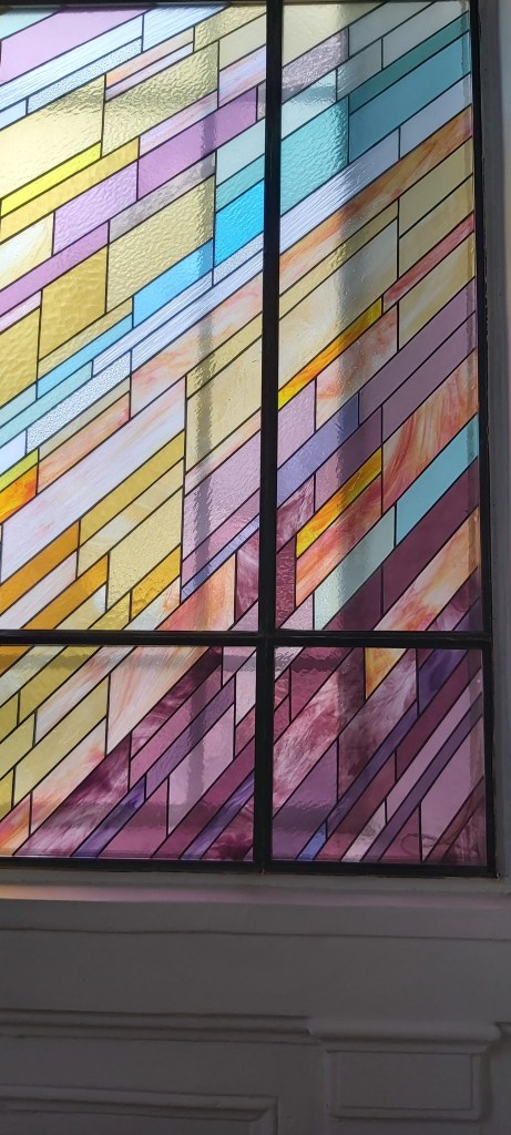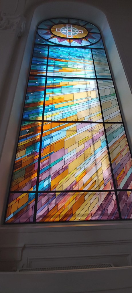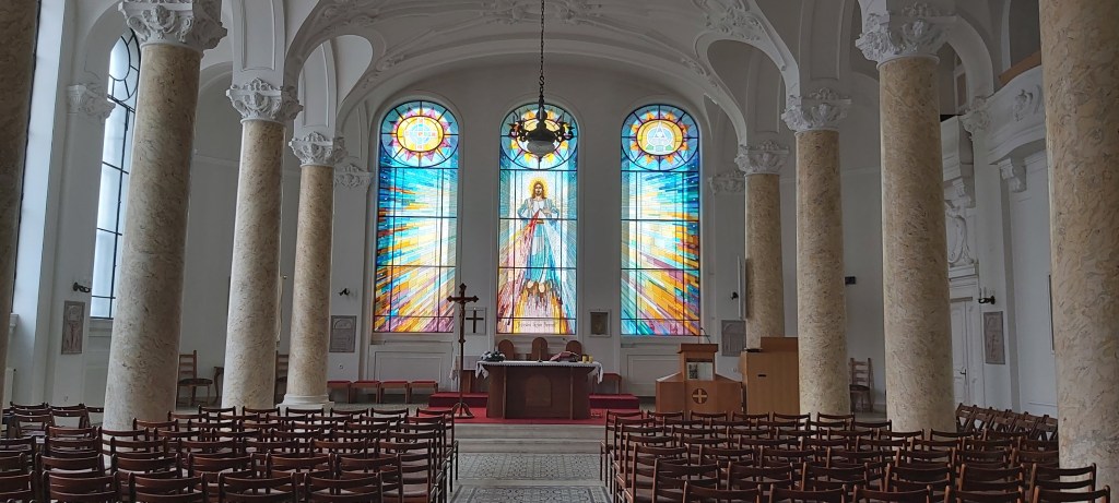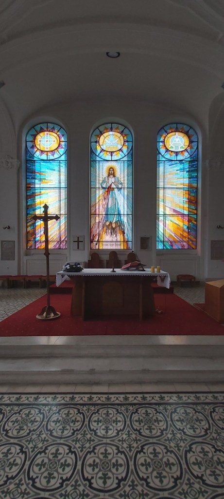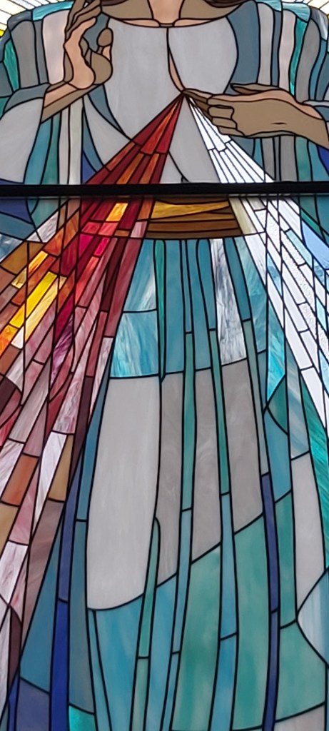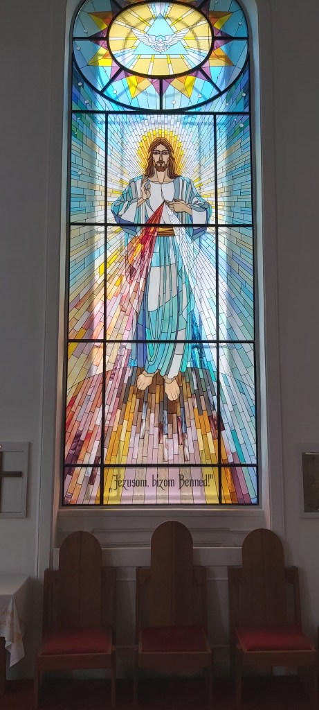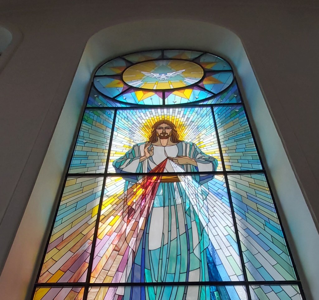 Az üvegablak hármas kapuja ott várt, ragyogva, szebben, mint ahogyan emlékeztem. Benne – a szívéből kiinduló sugaraktól övezve – az Irgalmas Jézus alakja, akit annakidején, 13-14 éve, a megrendelők kérésére főalakként meg kellett jelenítenem. Emlékszem a küzdelemre is, a szent alak körvonalazódása nem volt egy gyors folyamat… ők Szent Fausztina nővér Krisztusát szerették volna. De melyiket? A történetbe kicsit bevonódva, kutatva látszott, hogy több jóváhagyott képmás is született a látomás alapján, tehát ahogy éreztem is először, nem az egyik lemásolása az út. Végül megoldásként egy mai, kortárs értelmezés lett a kiválasztott, egy általam rajzolt Krisztus-alak, ahol mindazok a fontos jegyek – melyeket Fausztinától kértek – ott vannak. “Mert nem az ecsetvonások szépségében van ennek a képnek az ereje, hanem az én kegyelmemben…” mondta Jézus, Fausztina (az épp akkor készült képmás miatt aggódó) szavaira válaszul.
