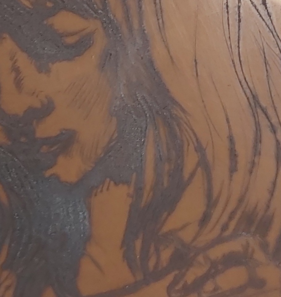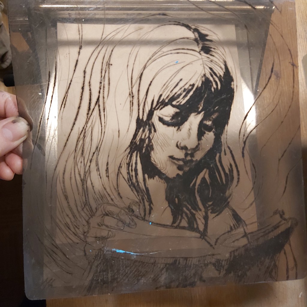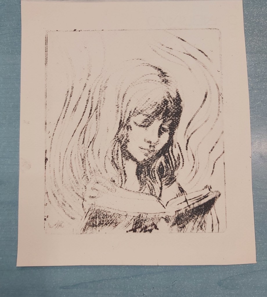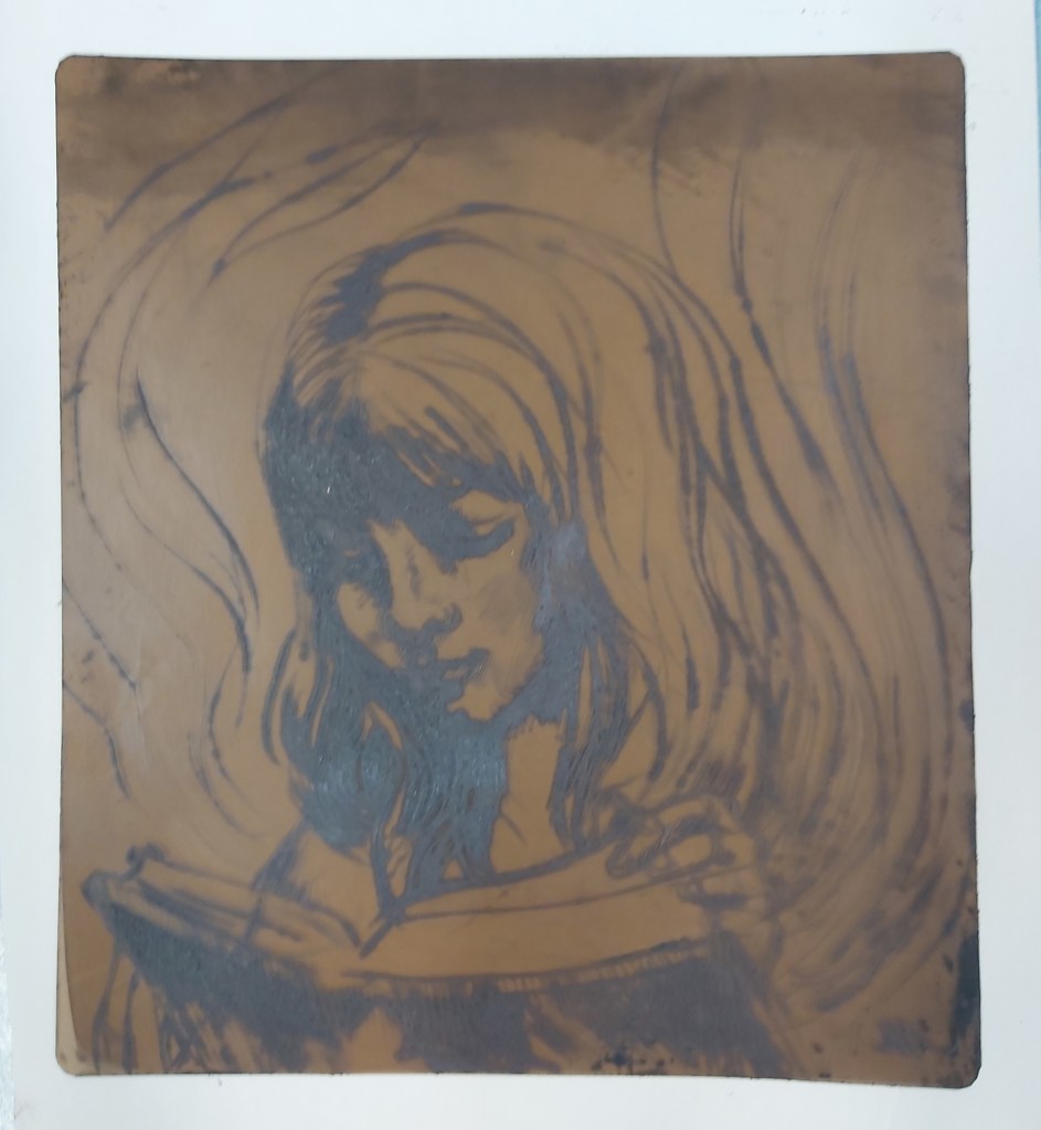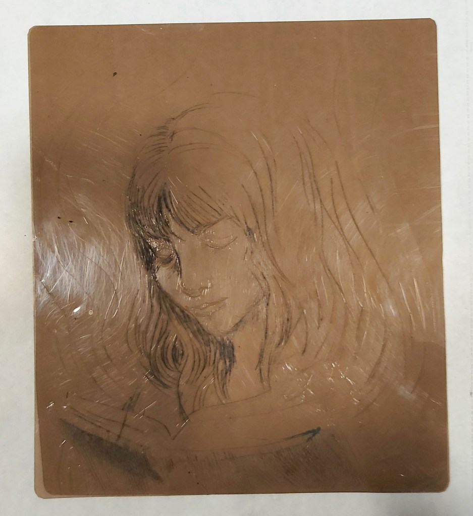 Hosszú idő után, csak úgy, örömből rajzoltam, kipróbálva egy technikát (egyszerű, keményebb fóliára tűvel, azaz körzőheggyel karcoltam). A munkaközi próba szénporral készült, mert nem voltam présközelben, de a későbbi állapotról készült nyomat is. Karc, dúc, nyomat… – persze a festékes dúc szebb, mint ami a papírra sikerült róla, de majd még próbálkozom normálisabb mélynyomó papírra.