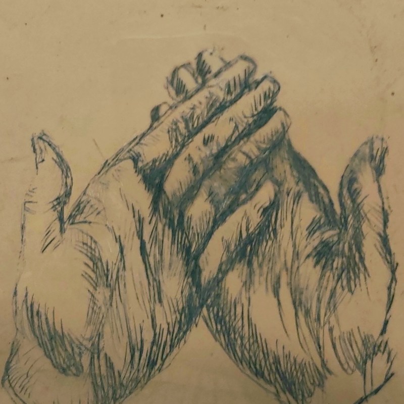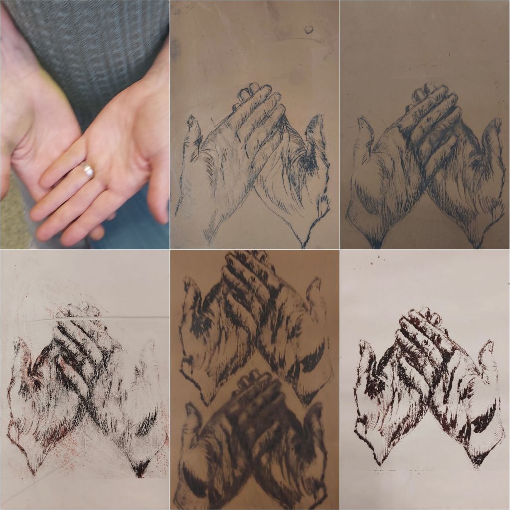 A legutóbbi megtapasztalásokat muszáj volt tanítványaimmal is megosztanom, néhányukkal, akiket érdekelt. Kis méretben, vastagabb fóliára karcoltam egy gyors rajzot, a kezeimről készült fotó alapján. Szénporral néztük meg a köztes állapotokat, videó is készült a folyamatról (a fotót és a filmet is egyik kis diákom készítette). Később -már az óra után – nyomat is lett, az átlátszó dúccal is játszottam kicsit, az alábbi kollázsokkal mutatom az eredményeket. A képek alatt található linken látni a videót, amit a gyerekekkel közösen készítettünk.