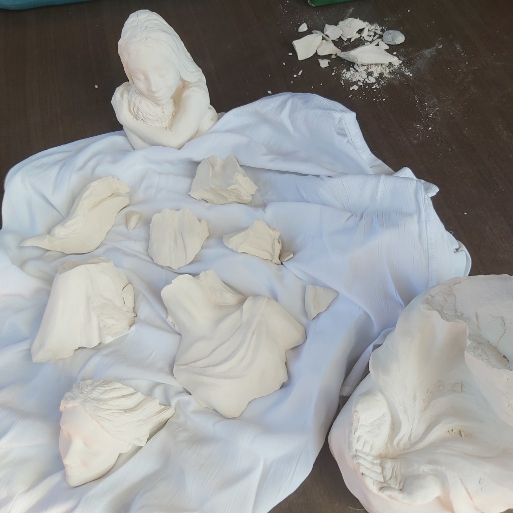 Időigényes volt ez a részletezős munka, de örömmel foglalkoztam vele: úgy gondoltam, hogy égetés előtt el kell érnem egyfajta tökéletes állapotot (ami már nem fog változni) ahhoz, hogy teljesen kész legyen a szobor. A határidő a legjobb múzsa, mondják, így idén, az Ars Sacra’s hétre befejeztem a Fohászt és a Megbocsájtást is, mehettek végre a kemencébe. De amikor égetés után kinyitottam a kemence-ajtót, hogy vigyem őket a kiállításra installálni, darabokra törve fogadott a “Fohász”: valószínűleg egy belső feszültség miatt (talán a kezdeti tömörítés ellenére véletlenül bentmaradt vékony levegősáv miatt) széttört égetés közben.