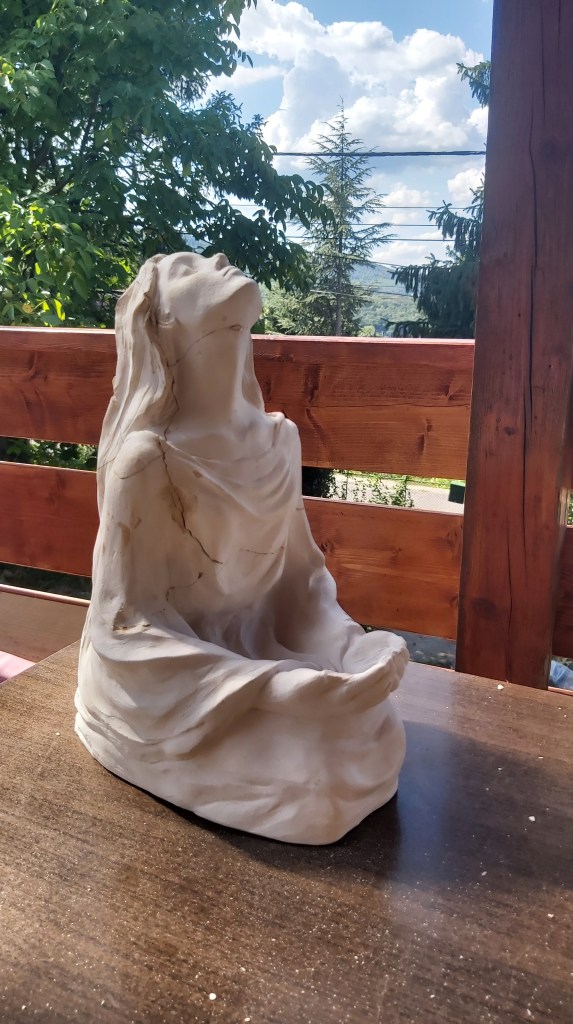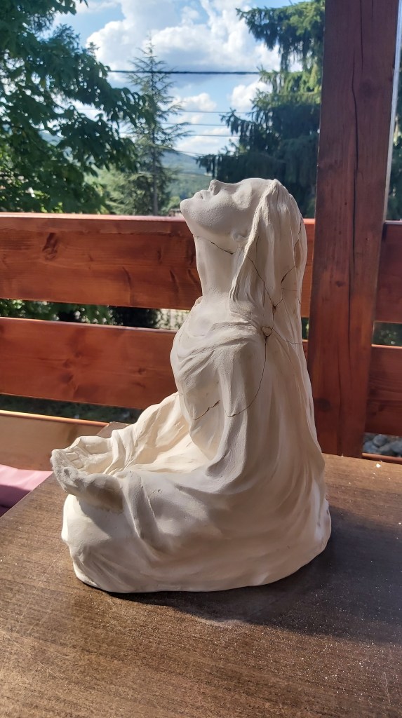 2023 nyarán született maga a “Fohász” című plasztika – és a belsejéből kivájt agyagból lett a “Megbocsájtás” című másik – de évekig vártam a kiégetésükkel, mert még nem voltam maradéktalanul elégedett a részletekkel. Elnagyolt volt a kéz, a fül, az ujjak, szerettem volna, ha a hajtincsek és az öltözék redői is összeszedettebbé válnak, ezért apránként finomítgattam őket.