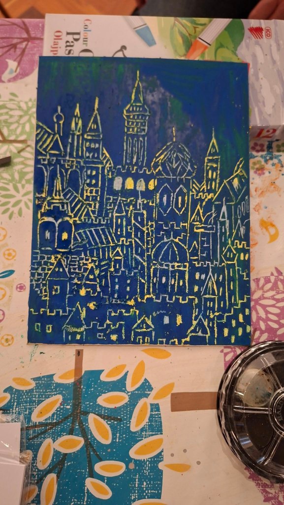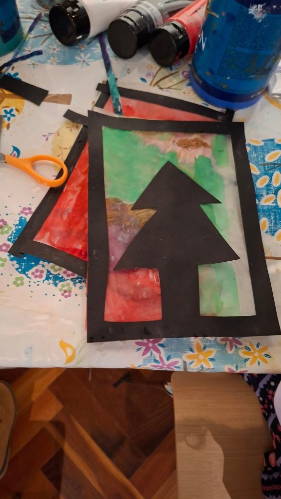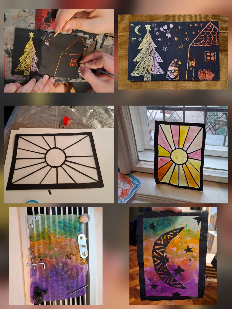 A képek miatt visszatérve a workshop elejére: kezdésként rögtönzött kedvcsináló mini-kiállítással indítottam, bemutatva a rám bízott két technikát, a viaszkarcot és ablakdísz-papírmetszetet. Jó dolgom volt, mert tanítványi alkotásokból már jócskán összegyűlt mostanra egy kiállításravaló. A papírmetszeteket (ablakdíszeket) mi csináltuk gyorsan lánykámmal, hogy abból is legyen minta. De a színes hátteret pár perc múlva már egy aranyos kis tanítványom festette meg hozzá, anilinnal pauszra.