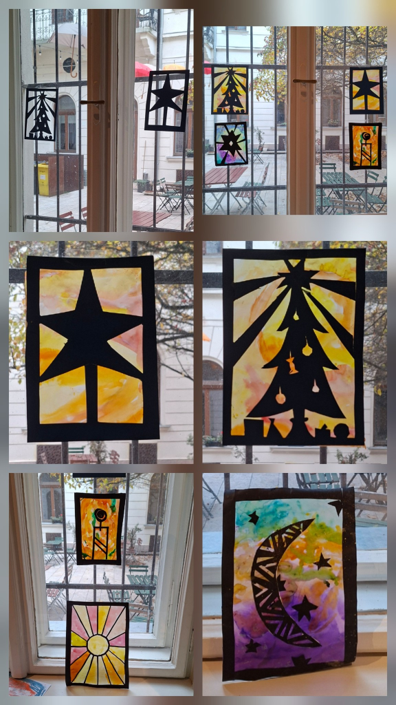 Néhány az elkészült ablakdísz-papírmetszetekből. Tényleg színes háttérrel élnek a leginkább. A gyertya térbeli spirális lánggal rendelkezik: tanítványom találmánya!… A gömbdísznek is 3D-be kihajtható lamellái lettek.