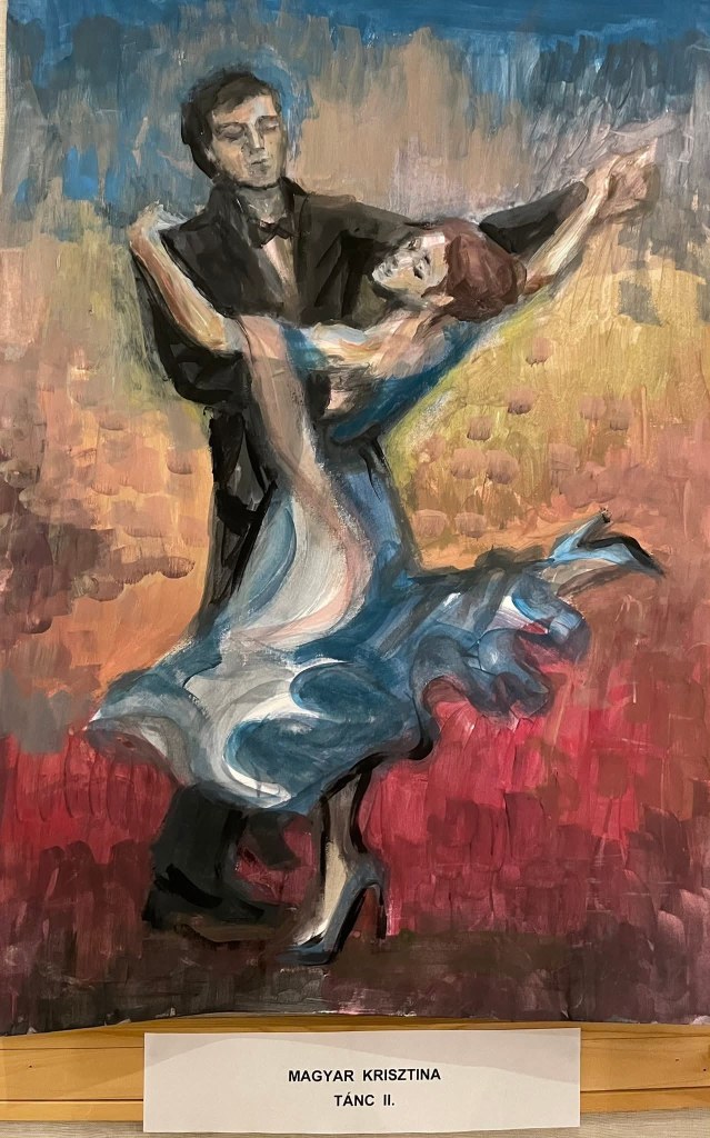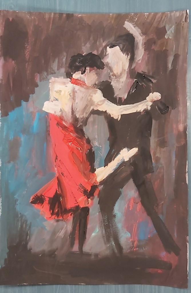 Van úgy, hogy az élet hozza a témát: most farsangi koncerthez kapcsolódó kiállításra kértek fel minket, művésztanárokat az Aelia Sabina Művészeti Iskolában. Óra végi elfestésekből (gyerekek elhasználatlan, de vissza már nem tehető festékei) születtek új képeim, Tánc I. és Tánc II. címen. Temperafestmények, tangózó és angol keringőző képzeletbeli párokról. Érdekelt, hogy a tánc karaktere mennyire határozza meg a képet. Nagyon! Gyors, friss kép született a tangóról, mert siettem haza a foglalkozás végén, ez volt az első “táncos képem”, az első fotók még a még meg nem száradt festékes állapotban születtek. De már akkor kb. kész volt a festmény. Kis javítások kellettek csak (egy hét múlva jutott csak rá időm, kiállítás napjának reggelén…). Megmaradt frissnek, mozdulósnak, átütő erejűnek – ami leginkább a táncnak magának köszönhető, nem pedig nekem. Hálás vagyok érte.