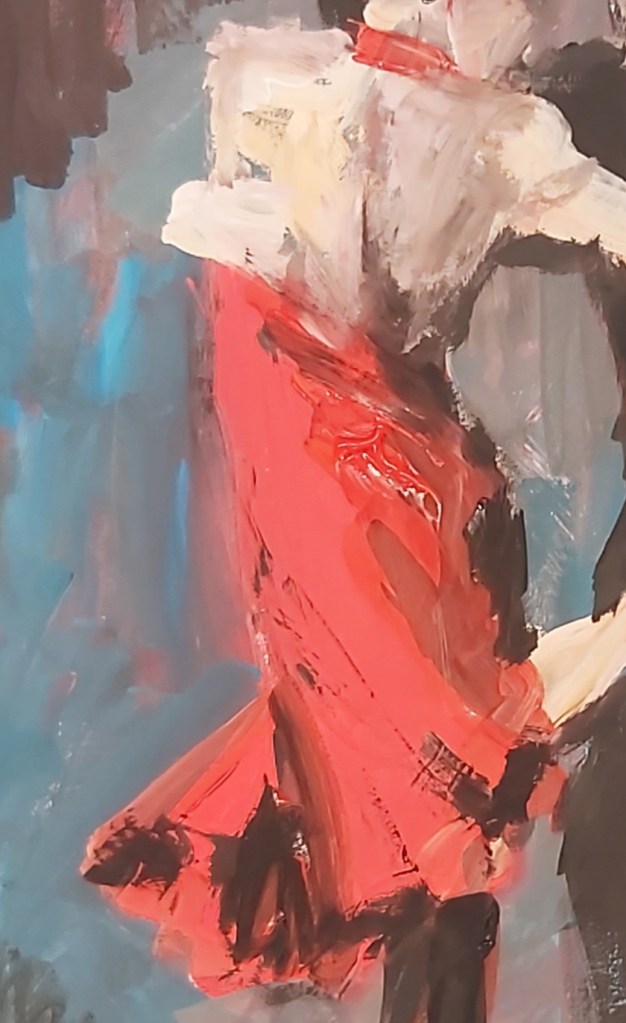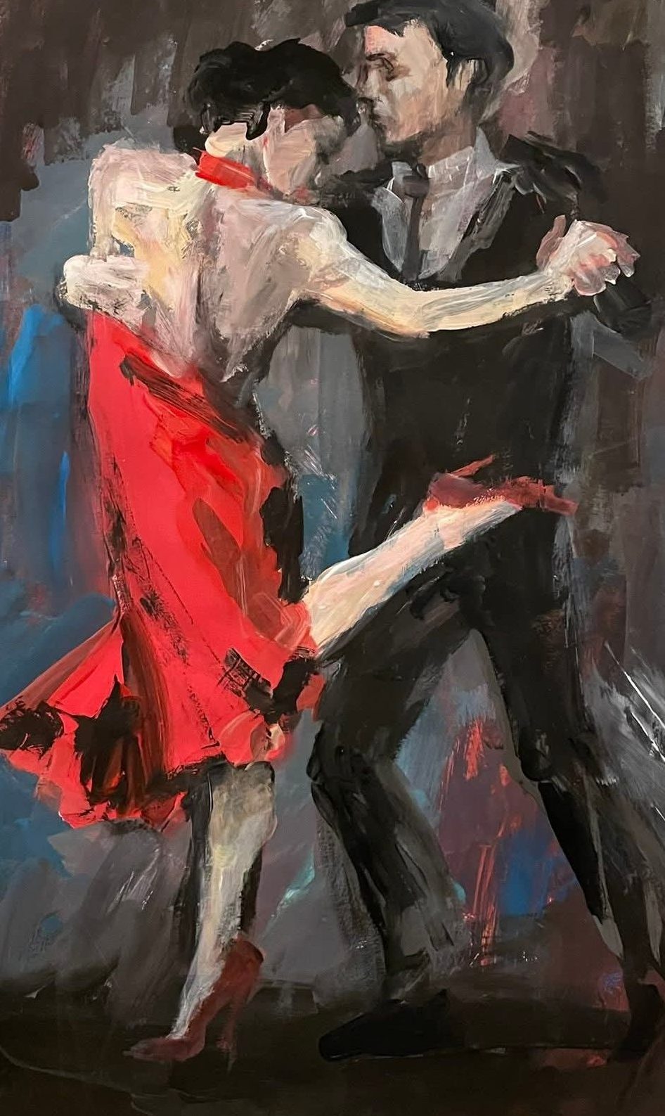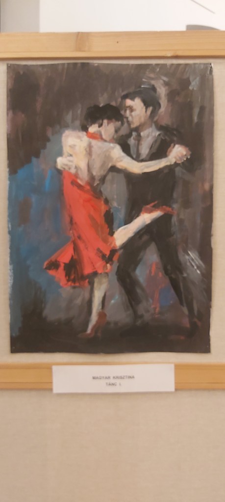 Sok visszajelzés érkezett, az első perctől hogy kikerültek a képek. Már a portás is méltatta, a kiállítóhelyen 🙂. Aztán ismerősök, barátok – azt mondják, megfogja, megérinti őket. Szerintem ez a tánc ereje és csodája, ahogy átjön még a festményen keresztül is. Különösen a páros tánc ereje. Az egymásra figyelés, összehangolódás művészete, ellentétes irányú erők dinamikus “egyensúlya”, ha létezik ilyen ebben a folyton mozgó, pörgő sodrásban. Nem konstans, hiszen folyton változik, mégis egy. A vonzásban egy. Gyönyörű “találmány” a tánc, szimbolikus, szenvedélyes és örök. Ott van benne az élet leglényege, tömören. Milyen jó, hogy a házasság hetében sikerült mindezt megmutatni, felmutatni! Öröm.
